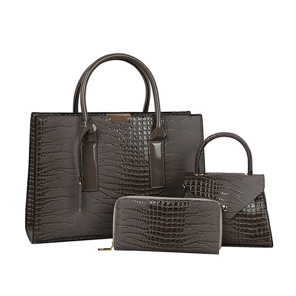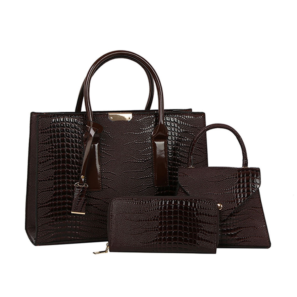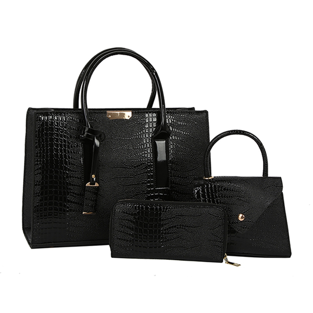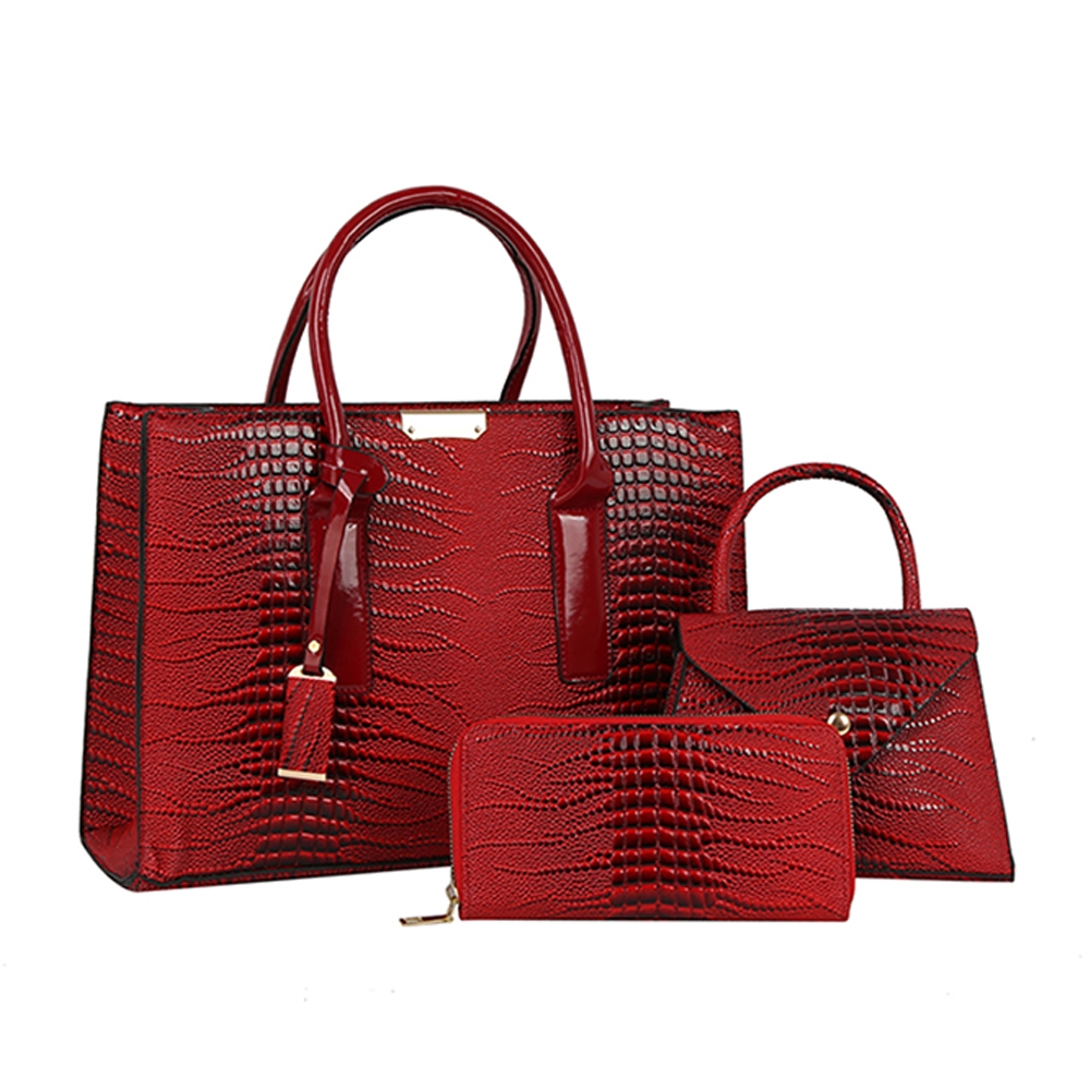 • A modern classic, this hand bag features a distinct faux alligator leather 3 in 1 set design. This item is perfect for anyone who loves to accessorize and add some personality to their outfits. Available in BK, CF, GY, RD. This item is sold in packs of 1.