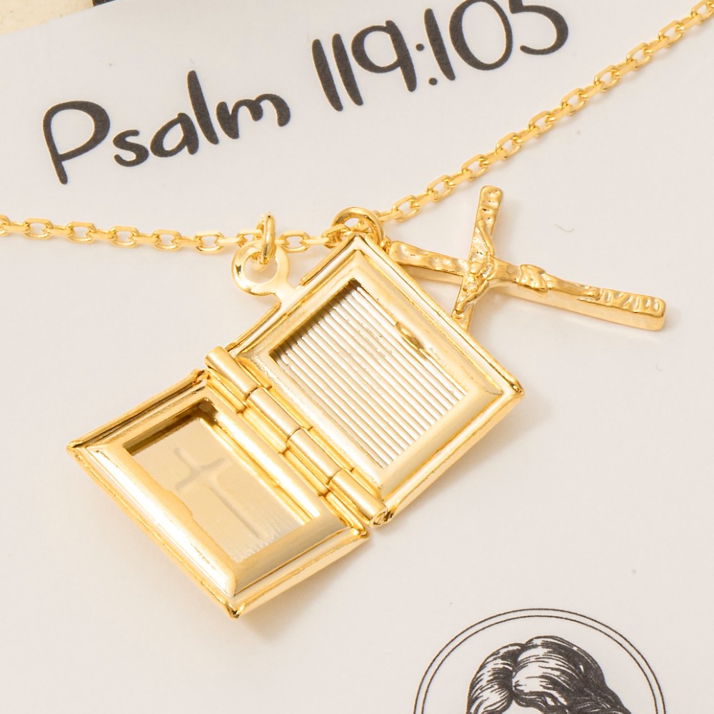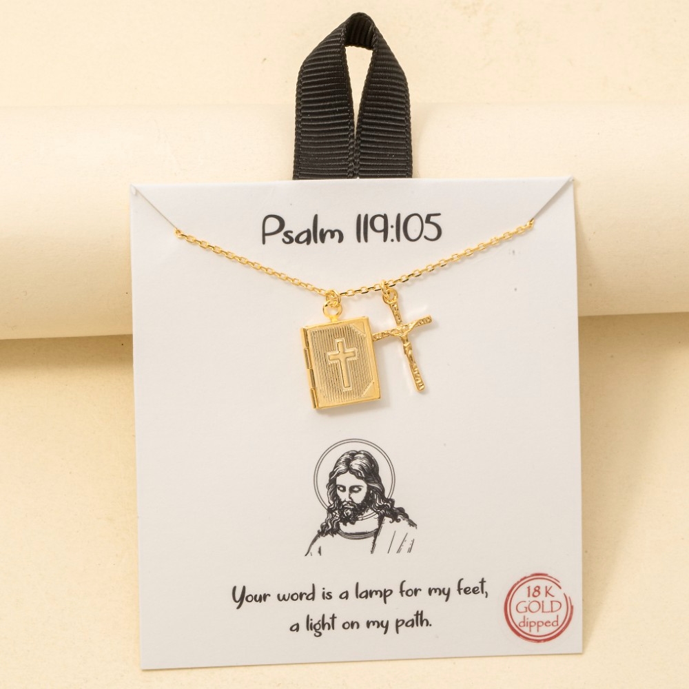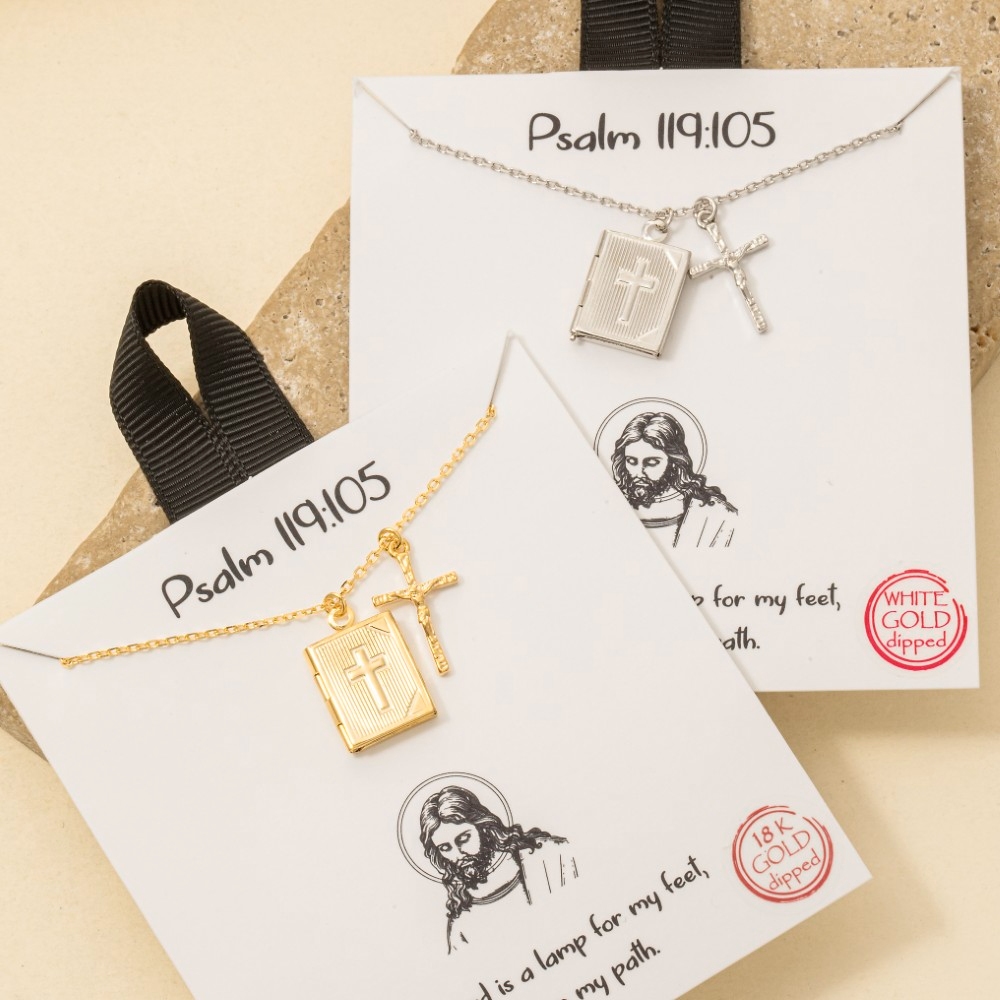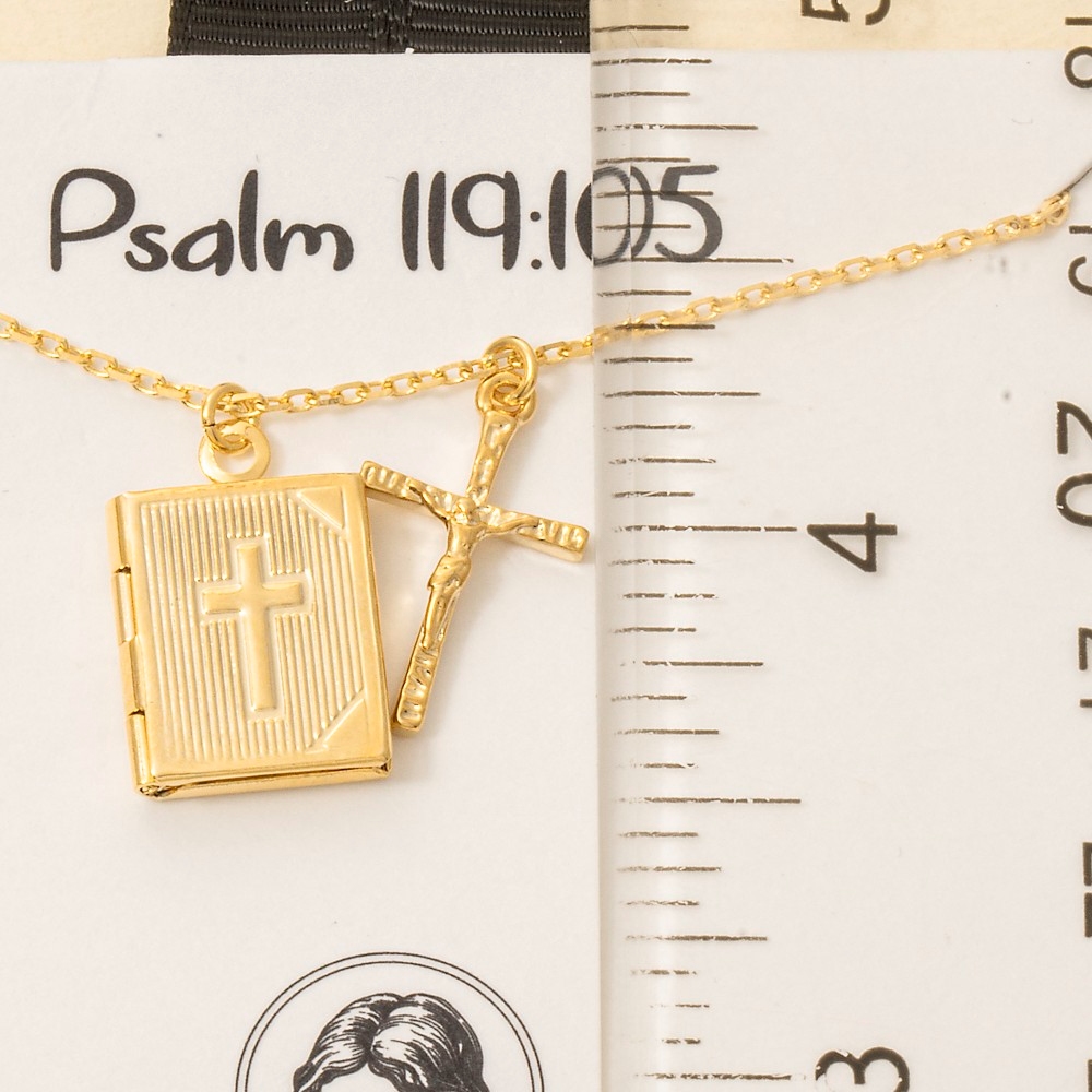 • Elevate any look, this necklace encompasses a grand gold dipped crucifix and bible locket pendant design. Perfect for dressing up your favorite outfit, this necklace is a must-have. Available in GD, RH. This item is sold in packs of 1.