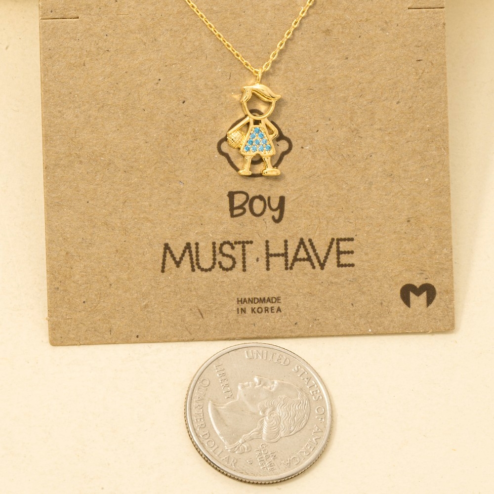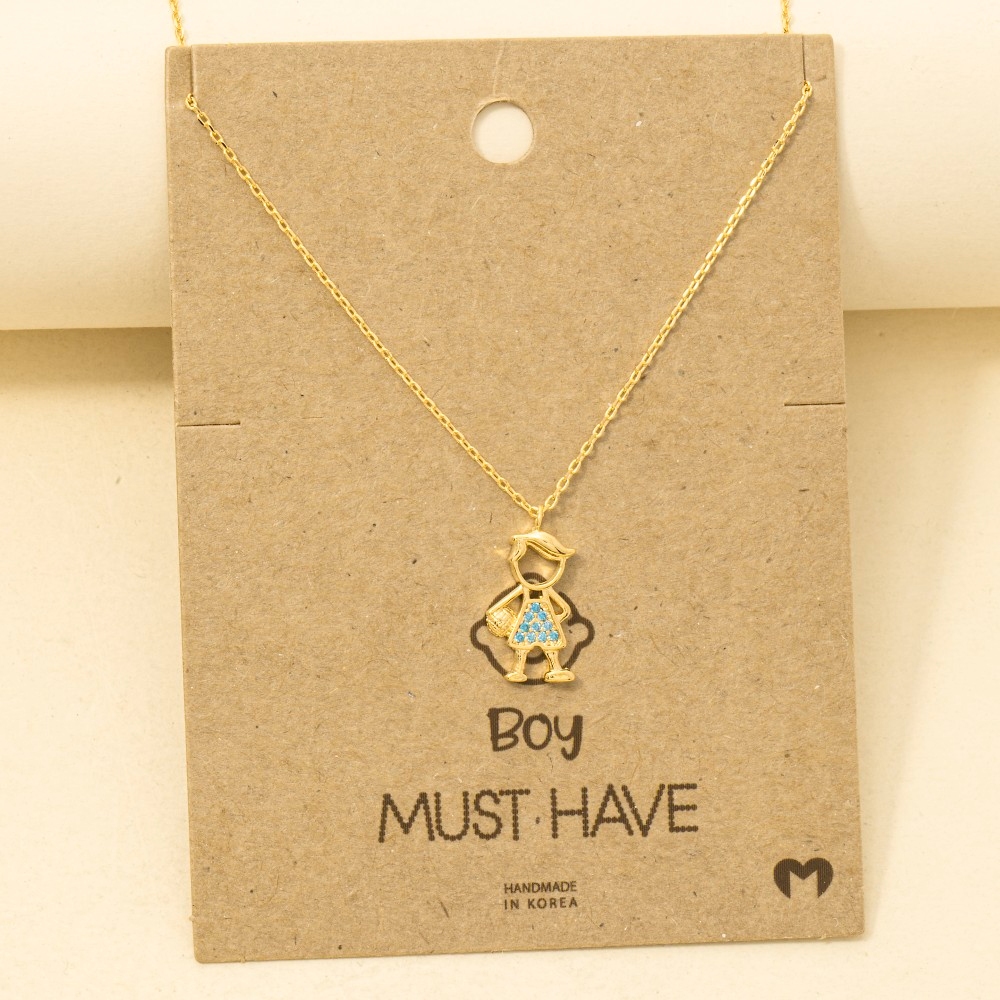 Elevate any look, this trending necklace features an exceptional gold dipped cubic zirconia studded boy figure pendant necklace design. Add a dash of sophistication to your look with this versatile trending necklace, a must-have for fashion enthusiasts. Available in G and S. This item is sold in packs of 1.