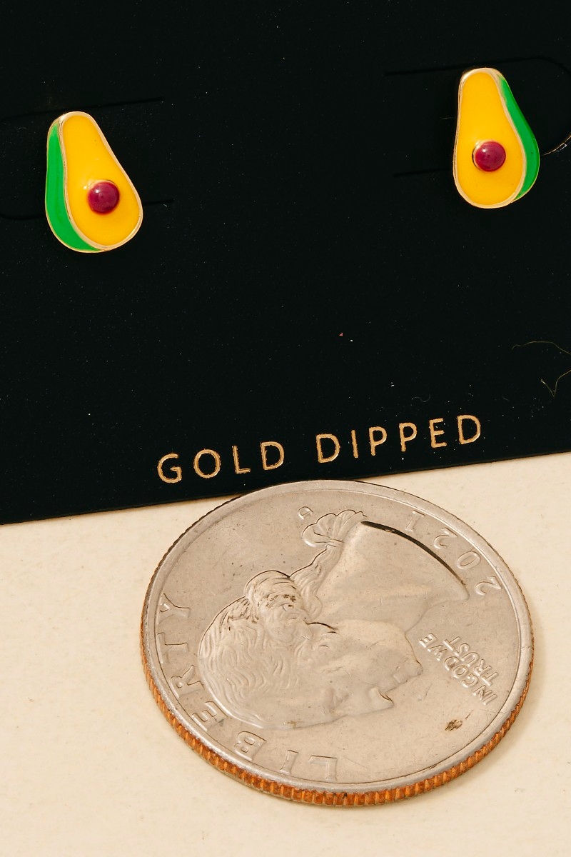 Add some edge to your wardrobe, this pair of stud earrings boasts a magnificent gold dipped epoxy avocado design. Infuse elegance into your daily wardrobe with the versatile charm of this must-have pair of stud earrings. Available in GOLD. This item is sold in packs of 1.