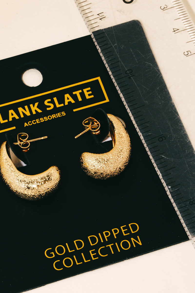 • This pair of gold dipped earrings brings a luxurious gold dipped half hoop earrings style. Elevate your ensemble with this pair of gold dipped earrings that effortlessly captures the essence of refined fashion.