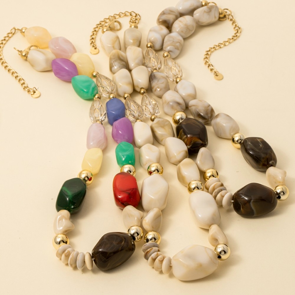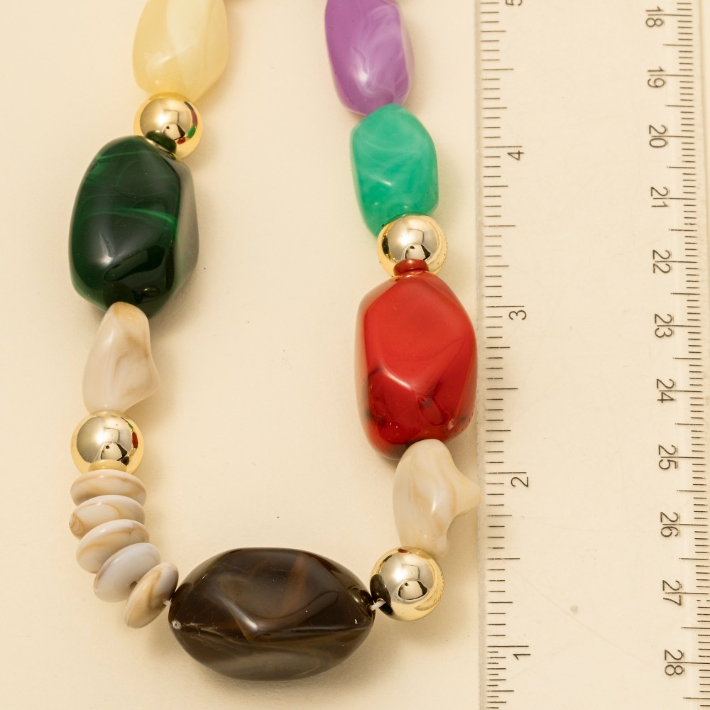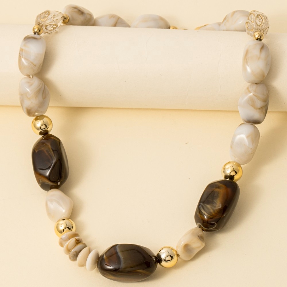 • A bold and daring choice that is sure to impress, this necklace encompasses a grand intricate chunky resin and metallic beads design. This item is a great way to add some texture and dimension to any outfit. Available in BR, IV, MU. This item is sold in packs of 1.