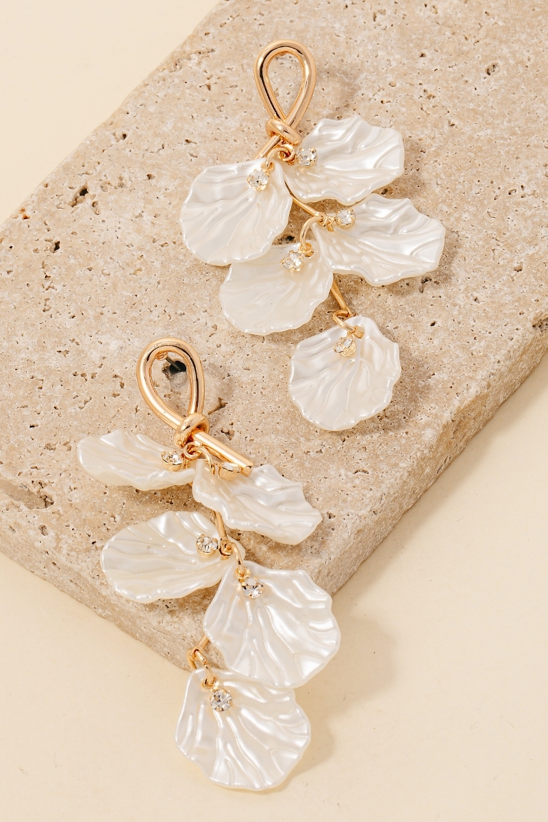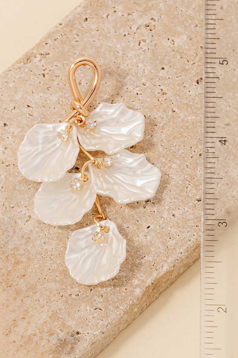 This pair of earrings brings a unique large acrylic pearl leaf dangle chain style. Savor the craftsmanship that goes beyond the ordinary, as this pair of earrings effortlessly captivates attention.