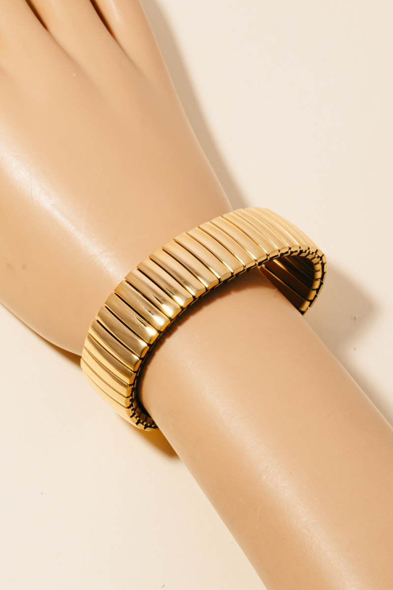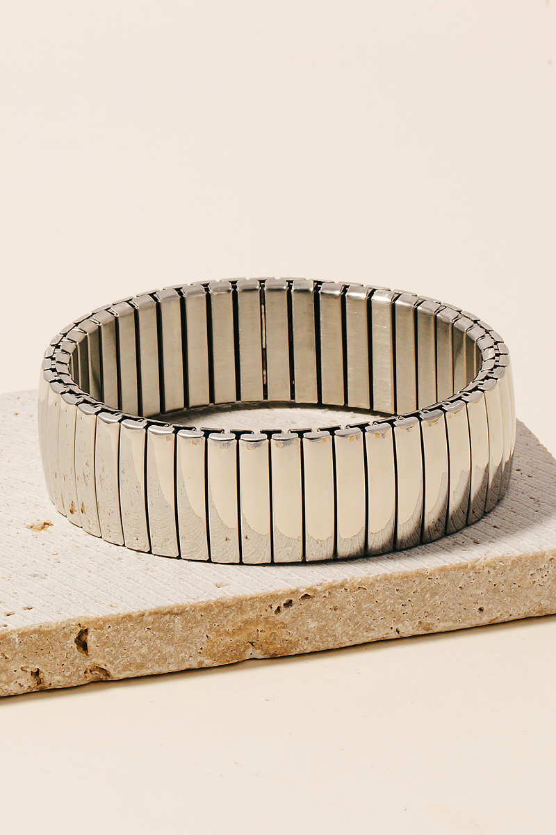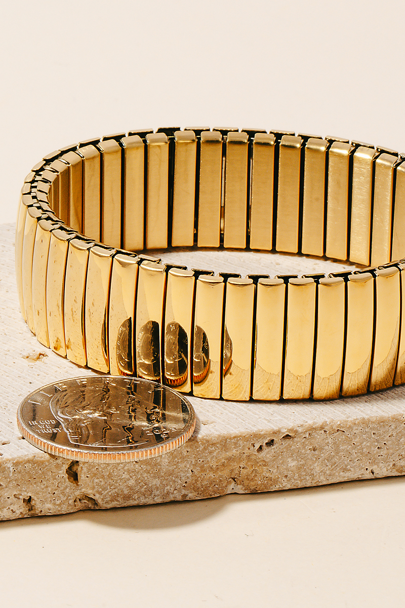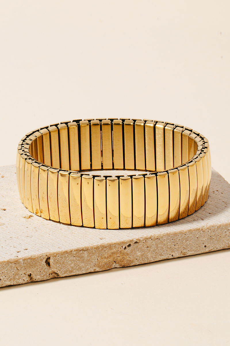 This piece is both timeless and on-trend, this bracelet introduces an exceptional metallic rectangle wide bars elastic design. This item is perfect for anyone who loves to accessorize and add some personality to their outfits. Available in G, S. This item is sold in packs of 1.
