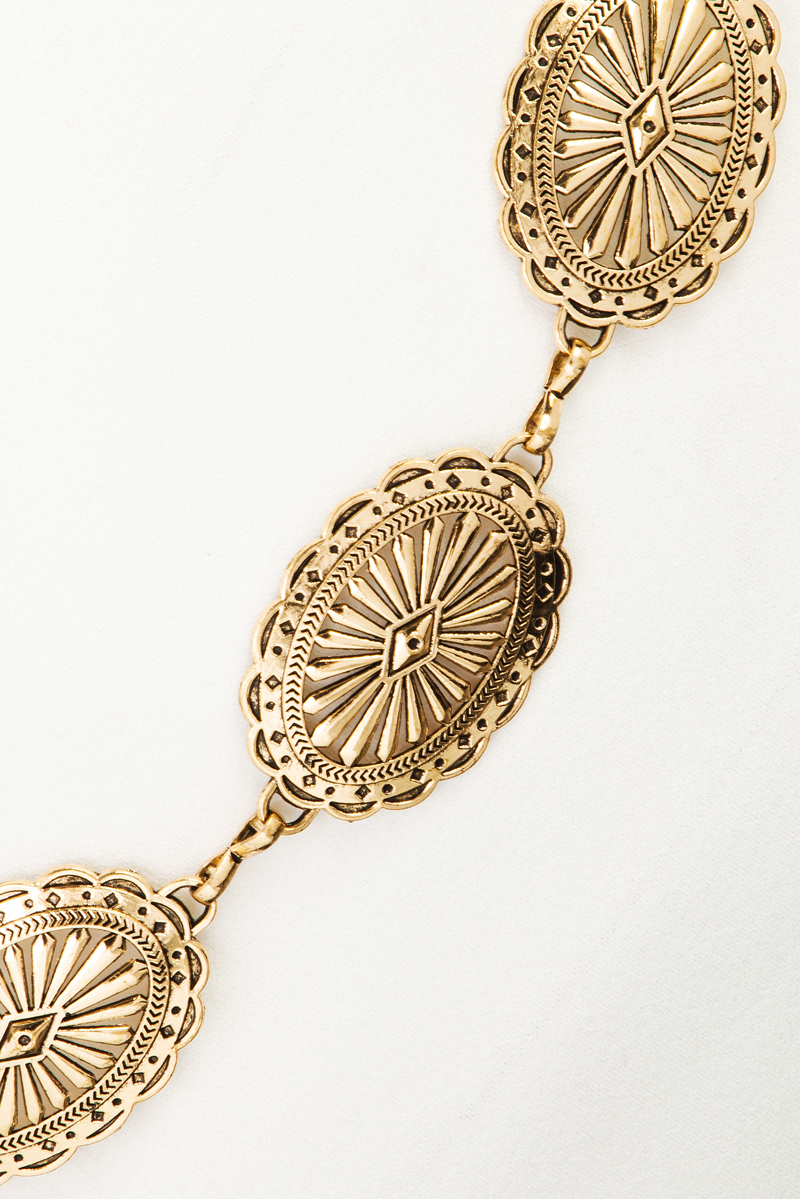 - Unleash your inner fashionista, this belt features a distinct oval concho disc chain link design. This belt is a great way to add some flair to your outfit without going over the top. Available in G and S. This item is sold in packs of 1.