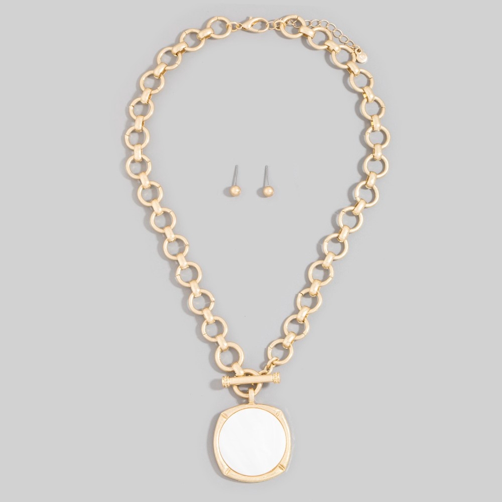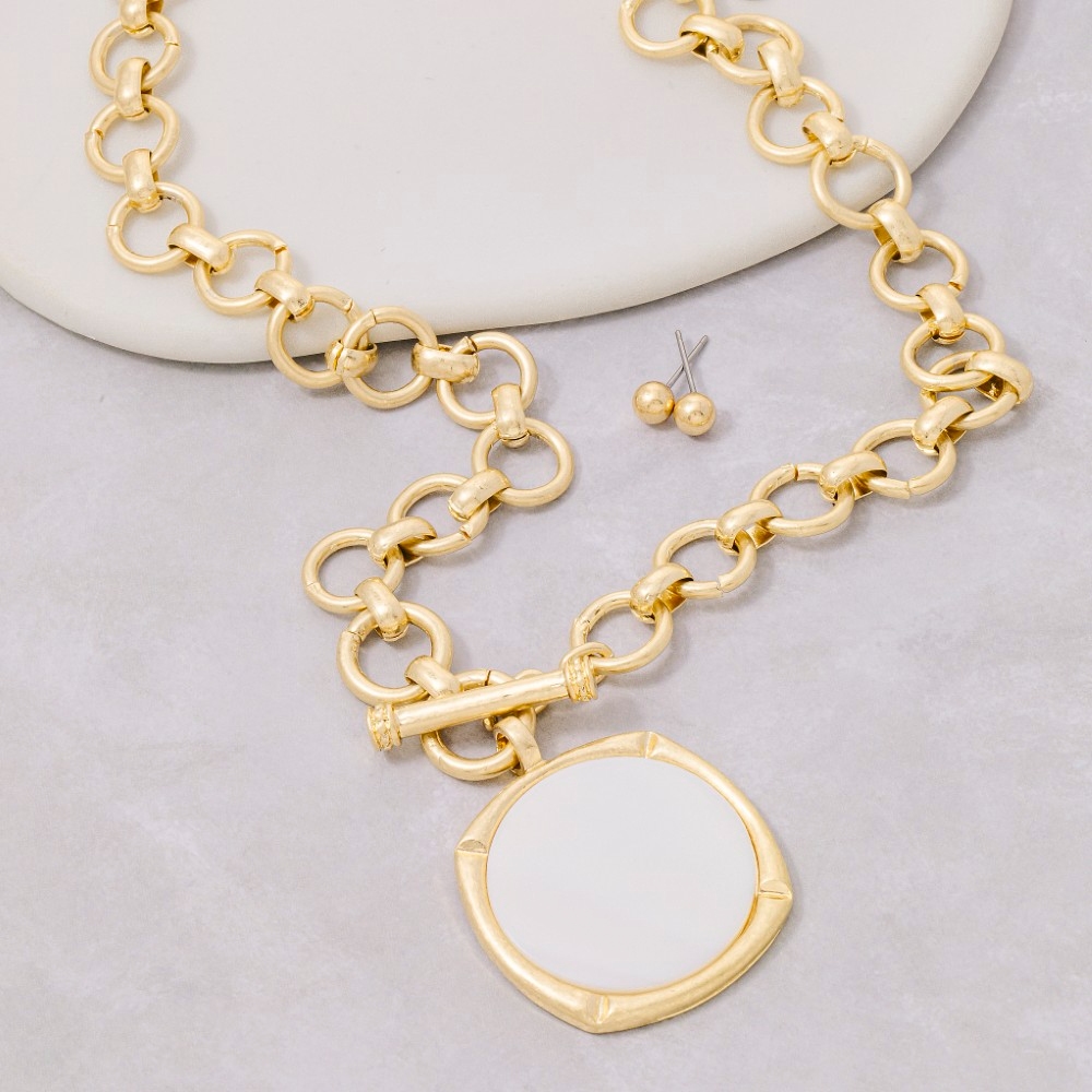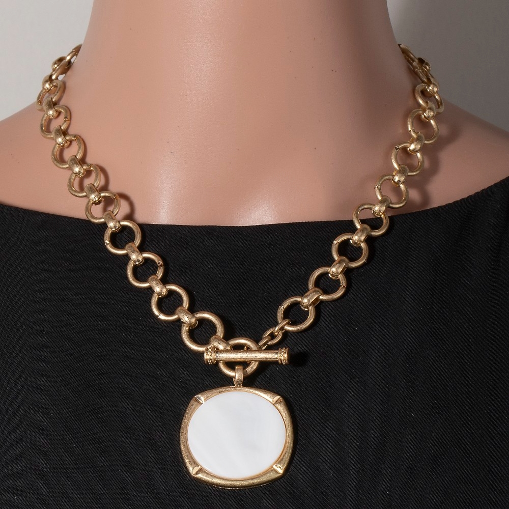• This piece is the epitome of sophistication and elegance, this necklace presents a striking rounded mother of pearl disc pendant set design. A versatile necklace that's perfect for any occasion, adding a touch of elegance and style to any outfit. Available in MOP. This item is sold in packs of 1.