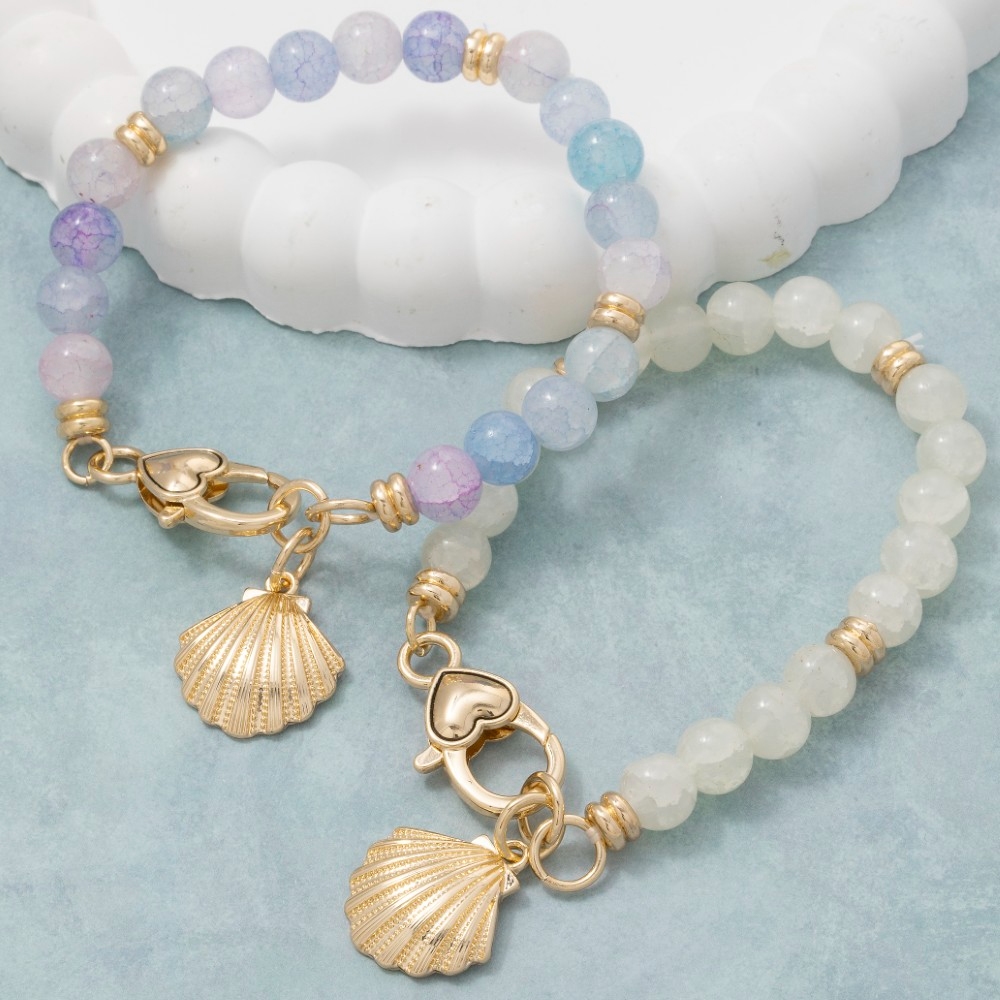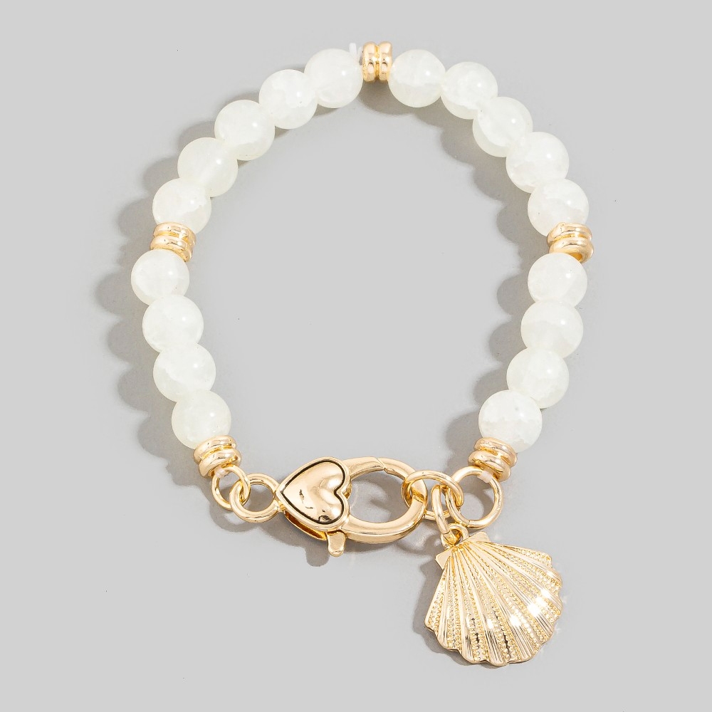 • Make a statement, this bracelet incorporates a remarkable sea shell charm and heart clasp glass beaded design. Infuse elegance into your daily wardrobe with the versatile charm of this must-have bracelet. Available in GBL, GWT. This item is sold in packs of 1.