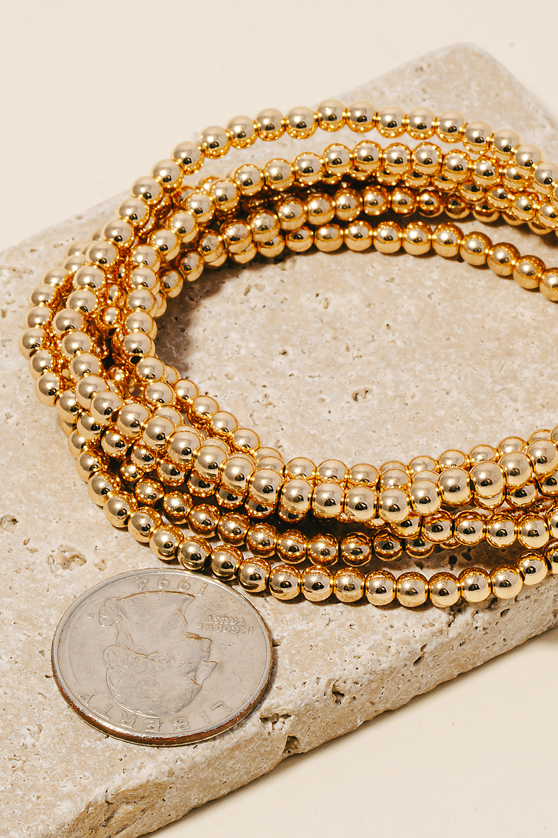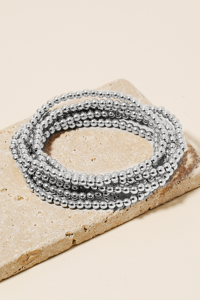 - Sleek, modern, and always stylish, this bracelet incorporates a remarkable seven layered mini metallic beaded set design. Upgrade your fashion game with this versatile bracelet, a timeless addition that complements any outfit seamlessly. Available in GD and SIL. This item is sold in packs of 1.
