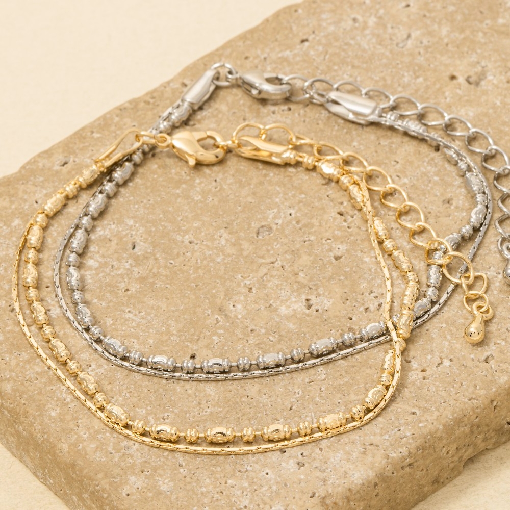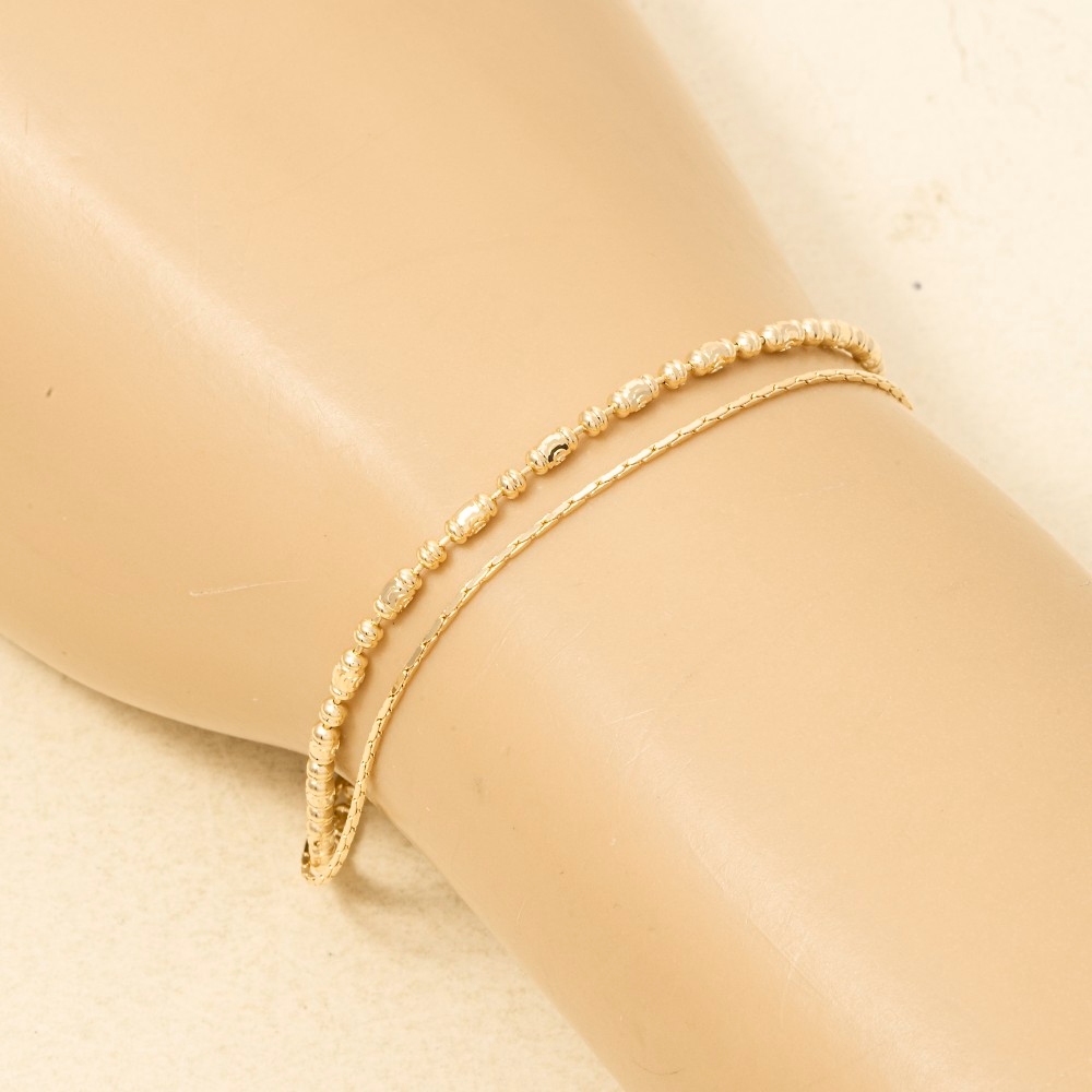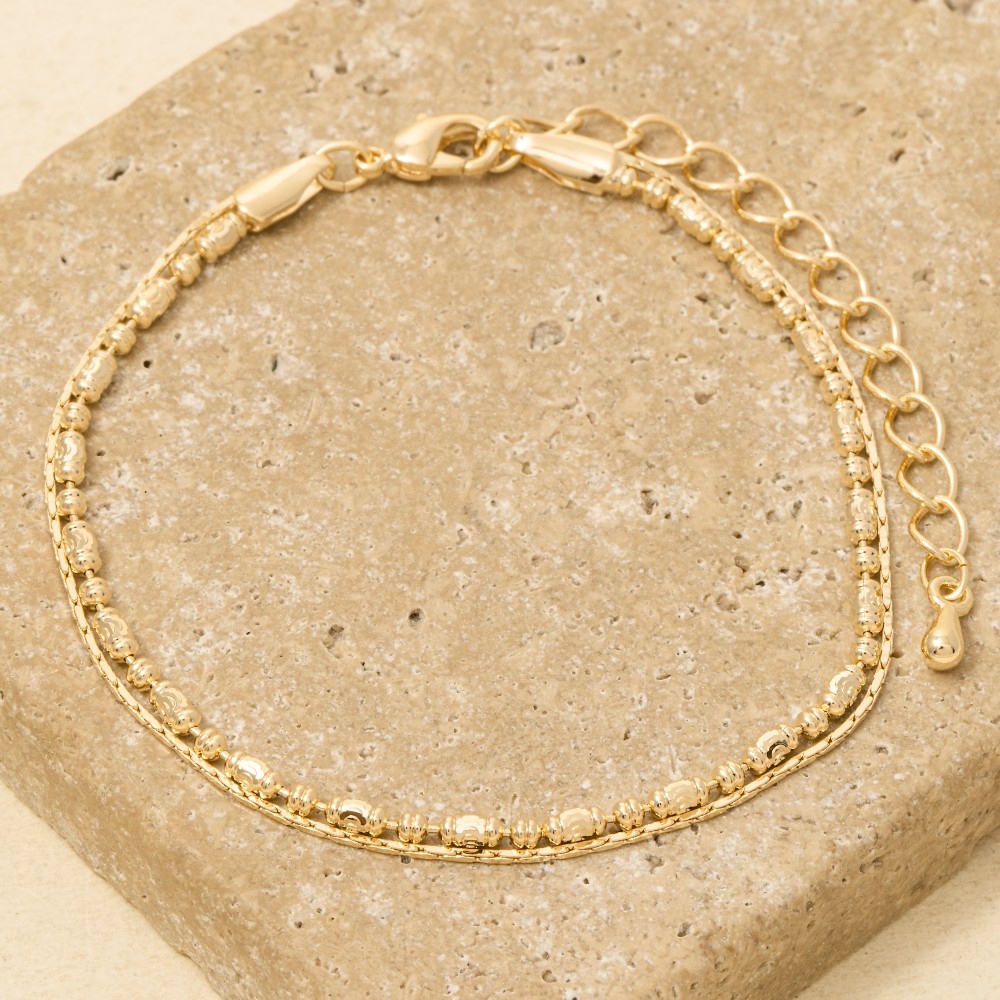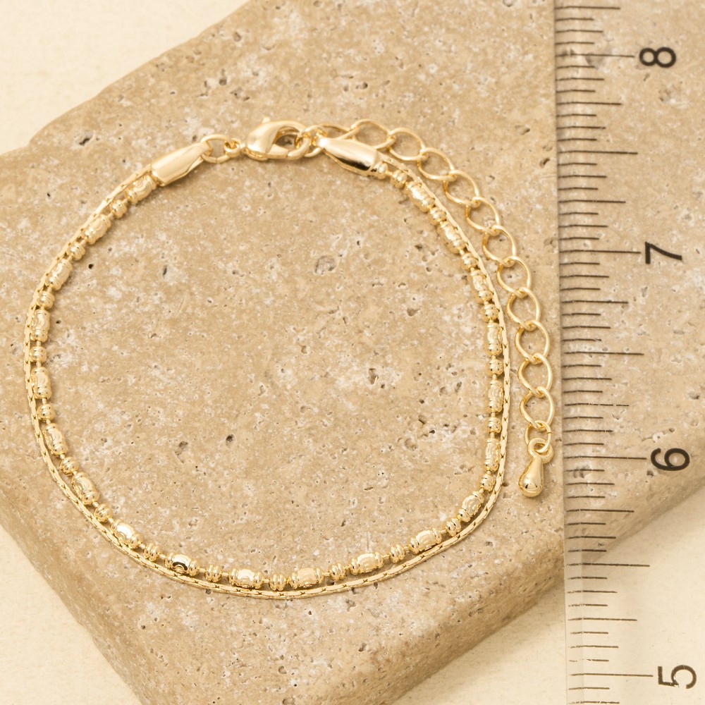 • A modern classic, this bracelet carries a charming two row snake chain and metallic bead design. This bracelet is a great way to add some glamour and sophistication to your outfit. This item is sold in packs of 1.