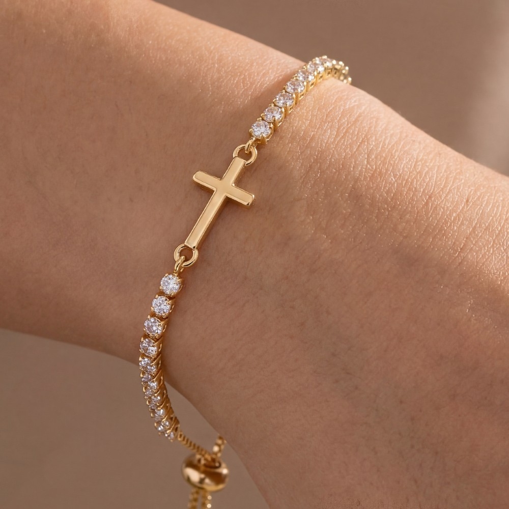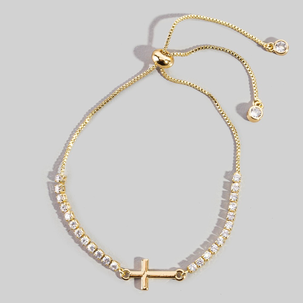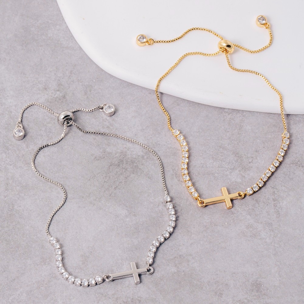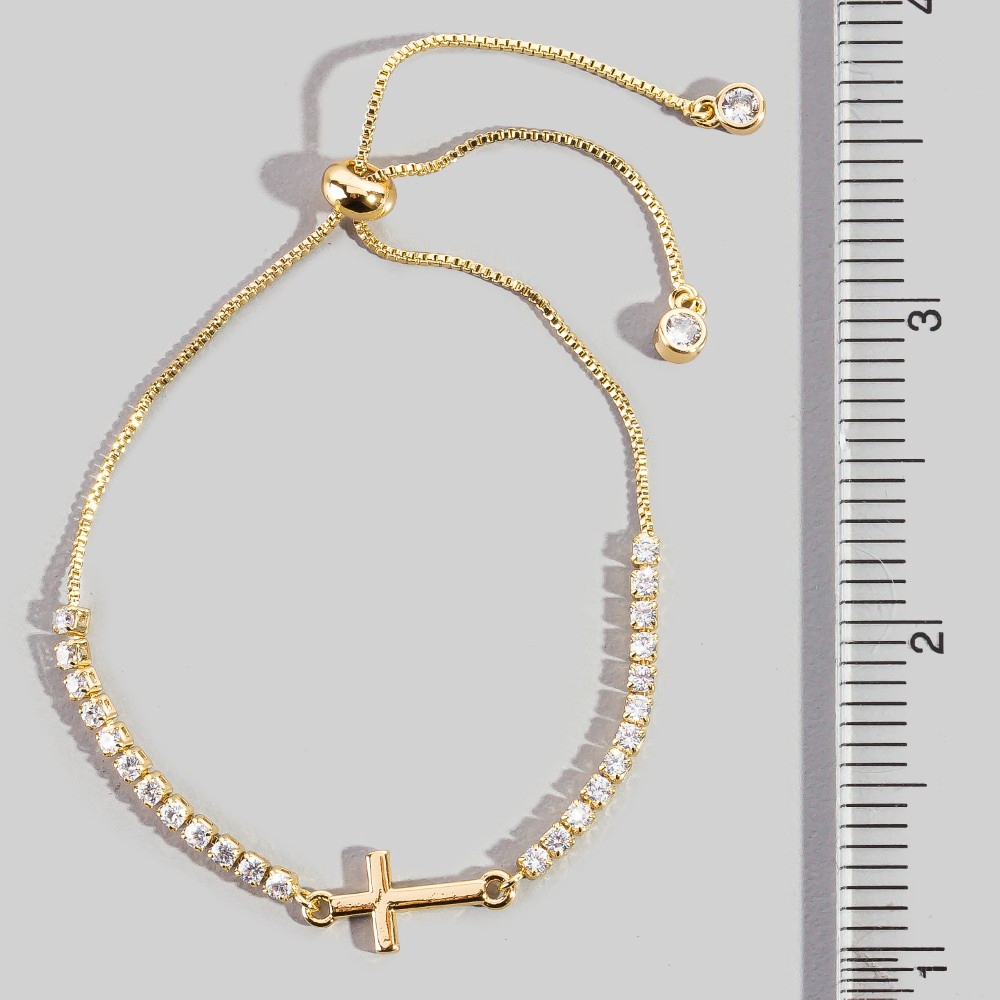 • Perfect for any occasion, from casual to formal, this bracelet includes a stunning cross charm cubic zirconia chain adjustable design. Elevate your fashion game with this versatile bracelet, seamlessly integrating into your signature style. Available in G, X. This item is sold in packs of 1.