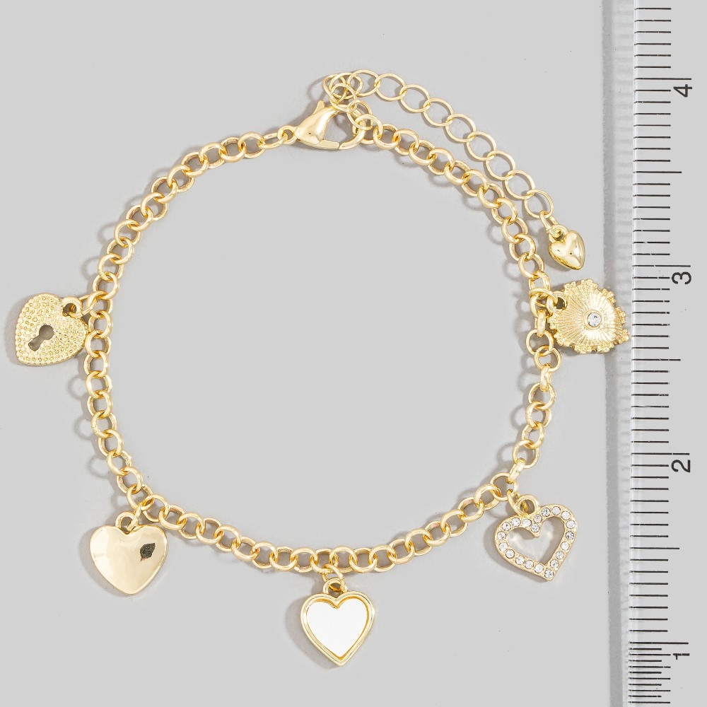 - Perfectly versatile and endlessly stylish, this chain bracelet contains a special assorted heart charms design. Master the art of accessorizing with this versatile chain bracelet, a key element for achieving a chic and polished look. Available in G, S. This item is sold in packs of 1.