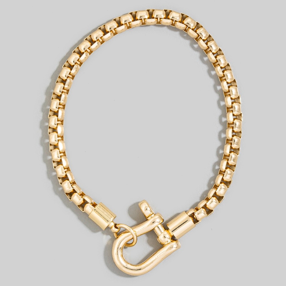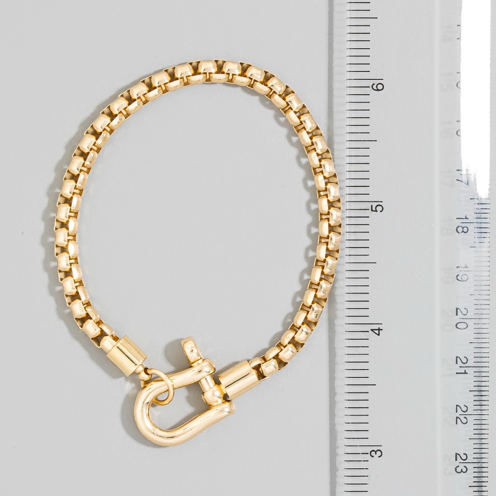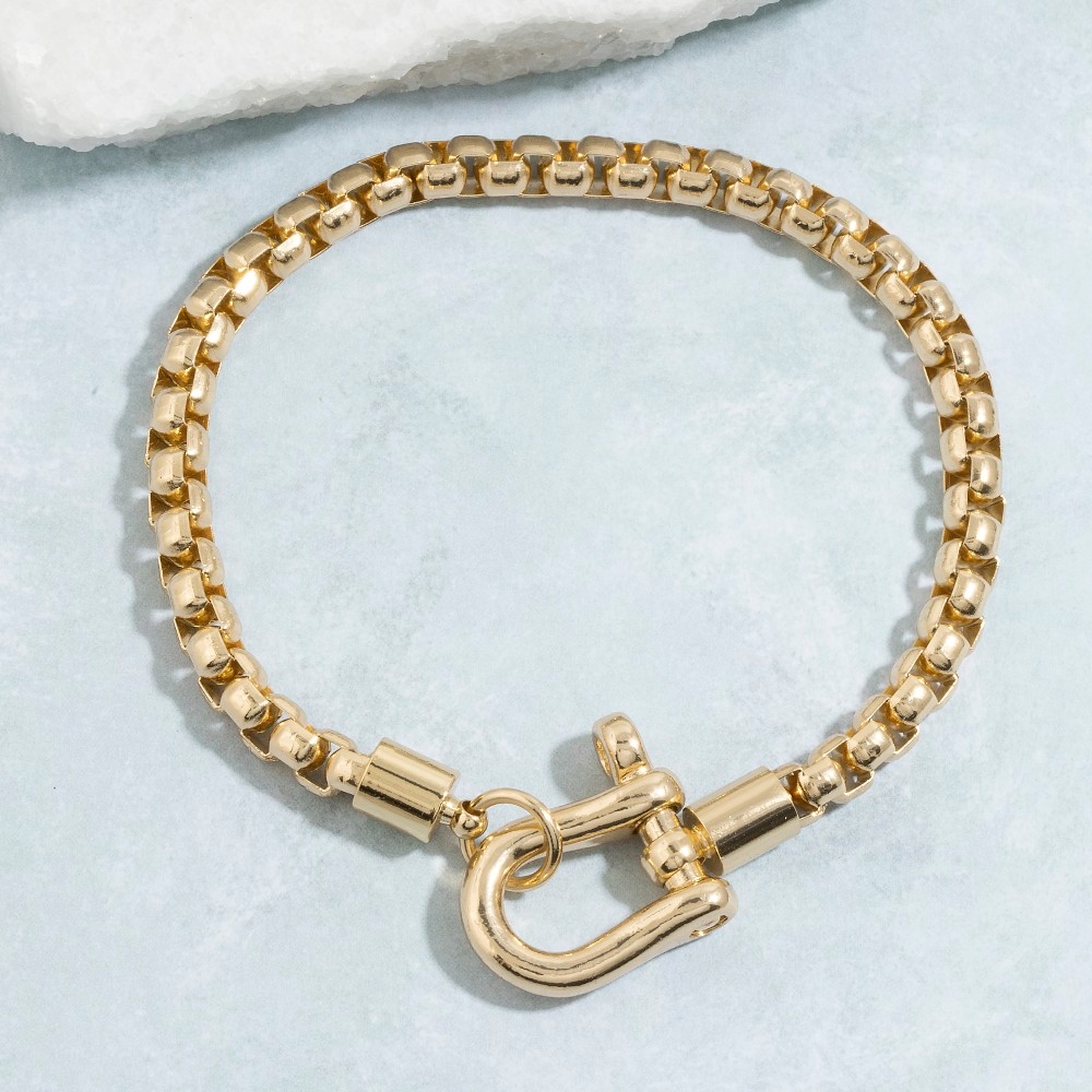 This piece is both timeless and on-trend, this bracelet embodies a sophisticated box chain shackle clasp design. Achieve a perfect blend of style and sophistication with this versatile bracelet, a fashion-forward choice for any occasion. This item is sold in packs of 12.