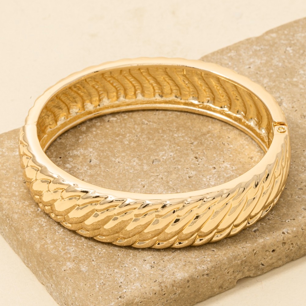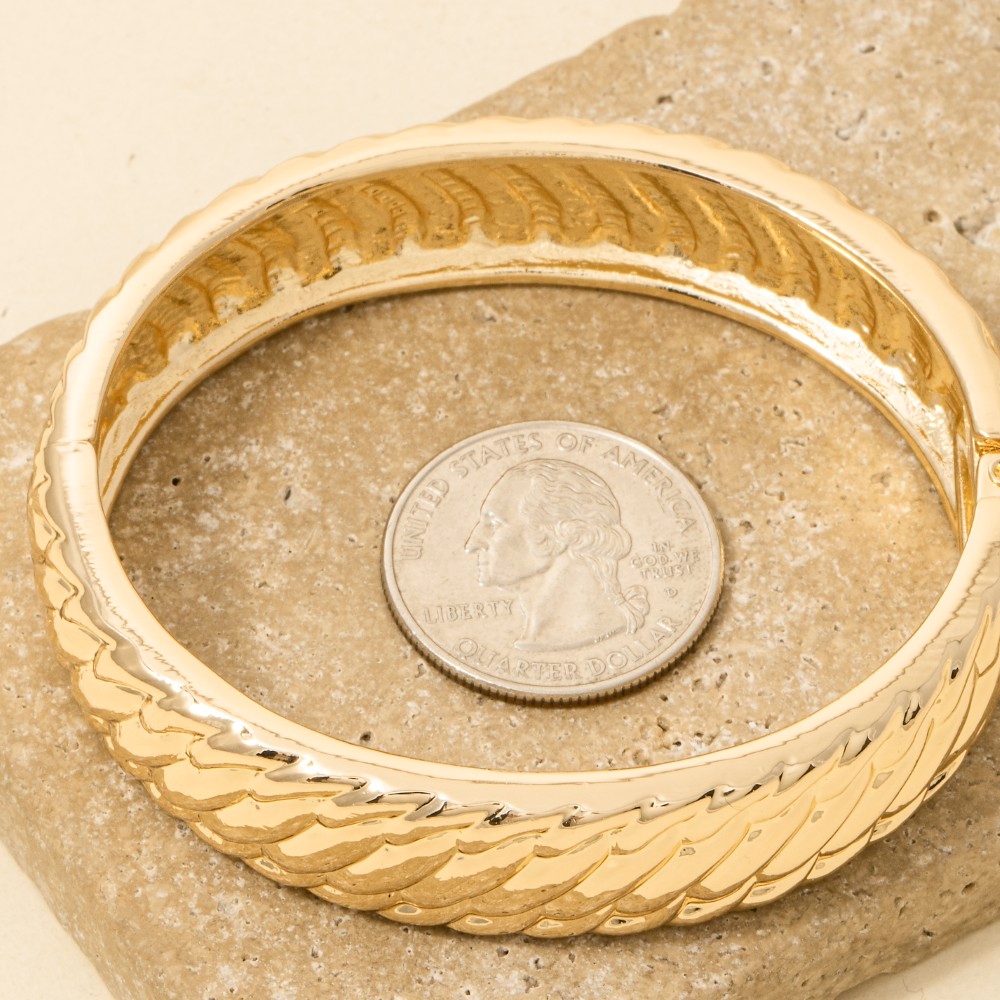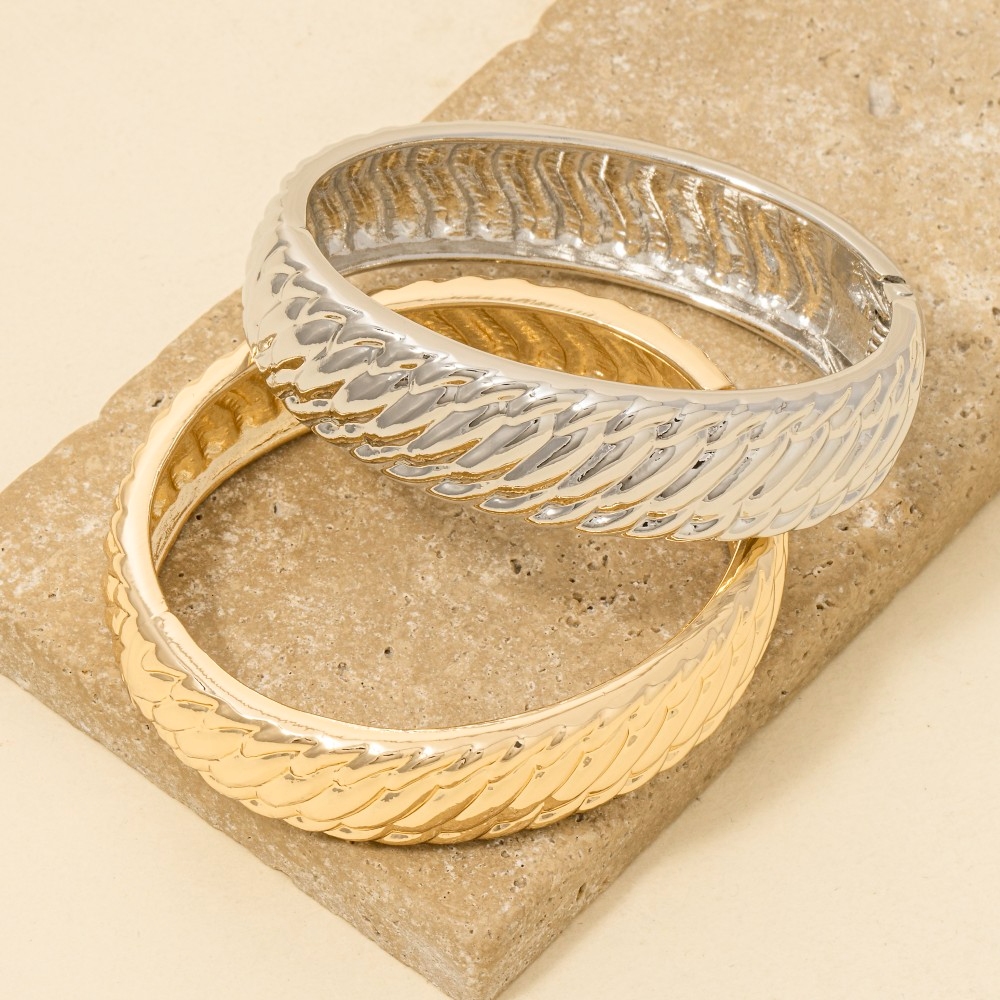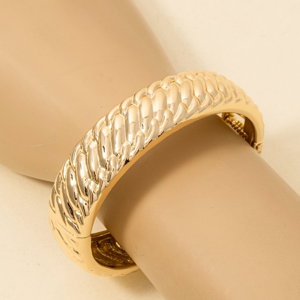 • Add some edge to your look, this bangle bracelet presents a striking braided ribbed metallic design. Infuse elegance into your daily wardrobe with the versatile charm of this must-have bangle bracelet. Available in G, S. This item is sold in packs of 1.