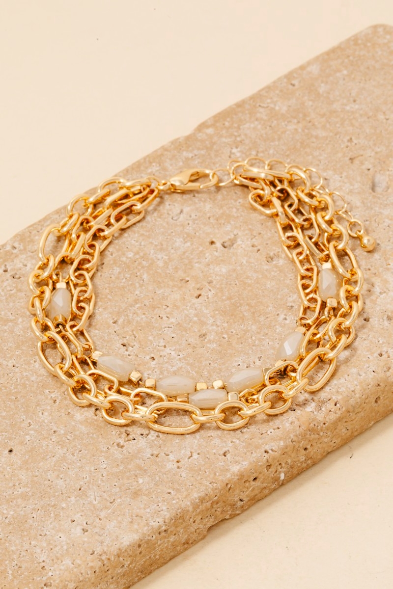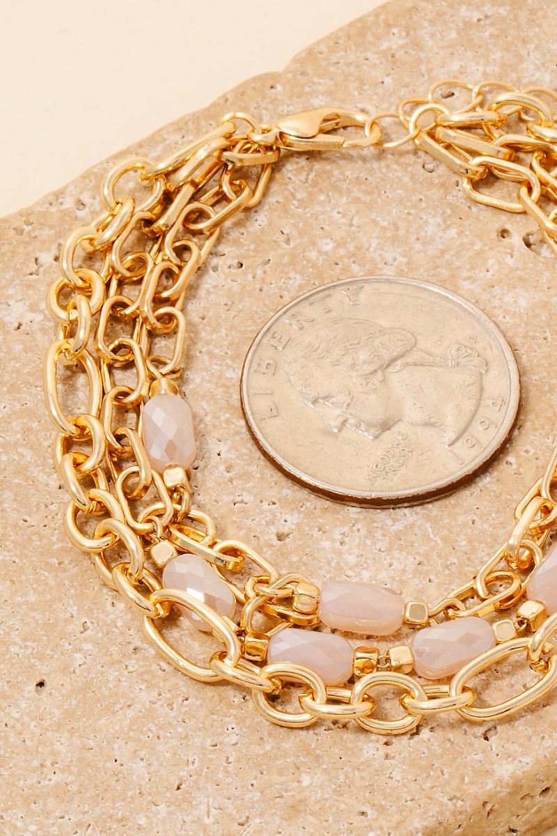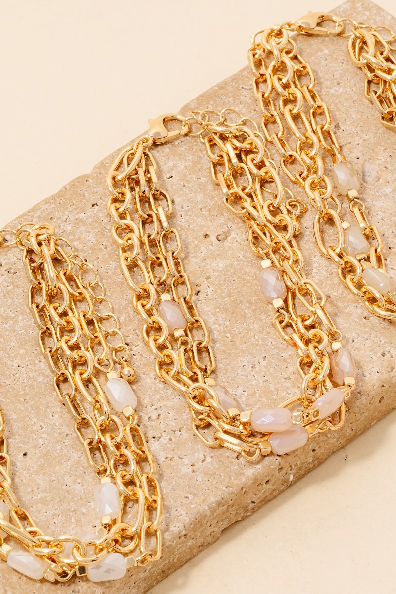 The perfect way to elevate any outfit, this bracelet displays a unique faceted rectangle glass beads layered chains design. Elevate your fashion game with this versatile bracelet, seamlessly integrating into your signature style. Available in GDGB, GDPK, GDWH. This item is sold in packs of 1.