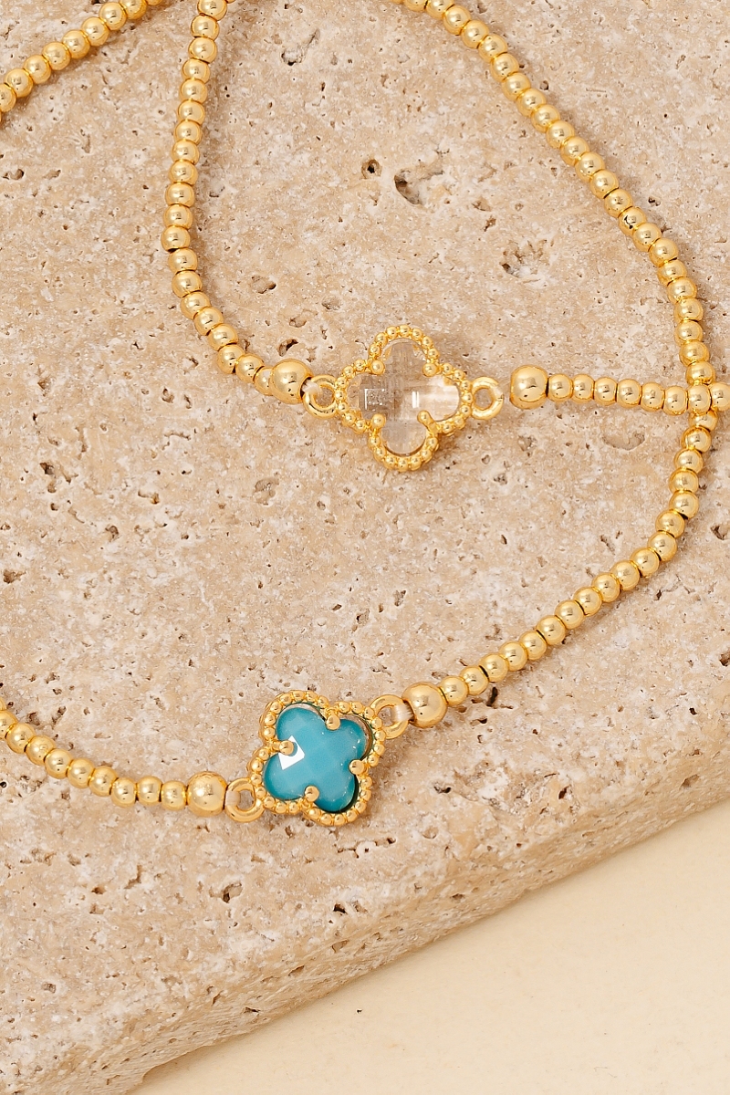 - This piece is both timeless and on-trend, this bracelet introduces an exceptional gold dipped faceted clear glass clover charm beaded design. This item is the perfect way to add some texture and interest to any outfit. Available in gold, 2gold and 3gold. This item is sold in packs of 1.