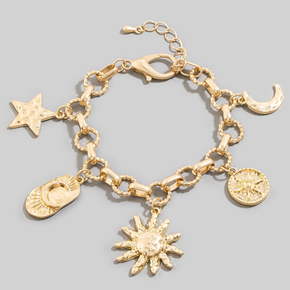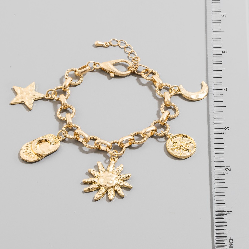 - Unleash your inner fashionista, this chain bracelet embodies a sophisticated moon star sun charms design. A stylish chain bracelet that's perfect for complementing any outfit you wear. Available in WG. This item is sold in packs of 1.