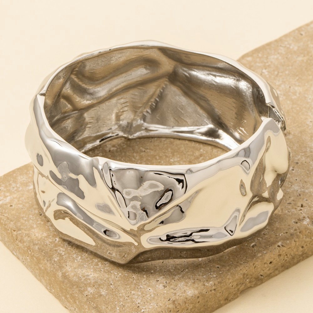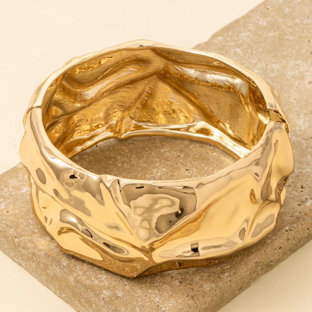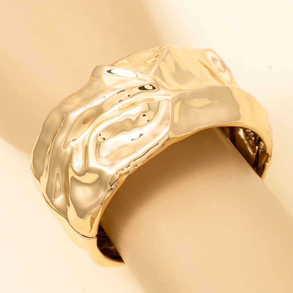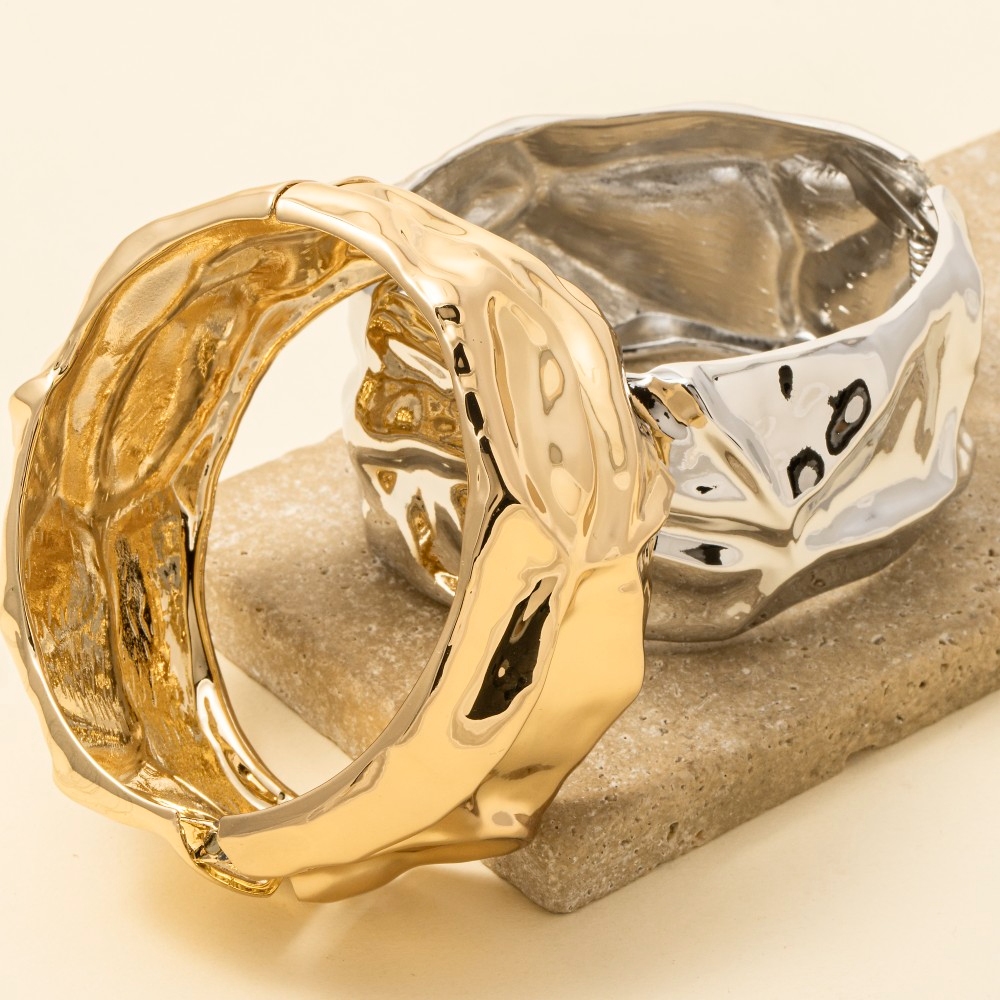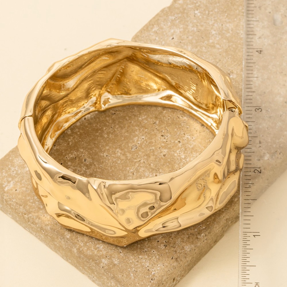 The epitome of sophistication and style, this bangle bracelet flaunts a luxurious crumple texture wide hinge design. Elevate your fashion ensemble effortlessly with this versatile bangle bracelet, a stylish choice for the modern trendsetter. Available in S and G. This item is sold in packs of 12.