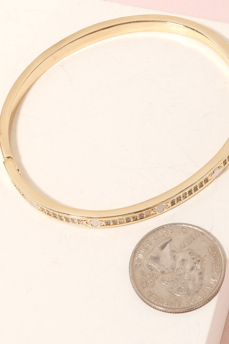 • A timeless piece that you'll wear for years to come, this cuff bracelet offers a remarkable cubic zirconia studded clover hinge design. This item is the perfect finishing touch to any outfit, adding a touch of glamour and sophistication. Available in GM. This item is sold in packs of 12.