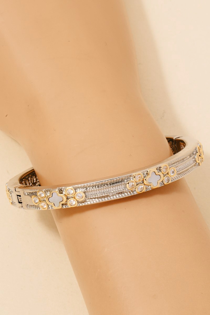 Gold Dipped Cz Mother Of Pearl Clover Hinge Bangle Bracelet