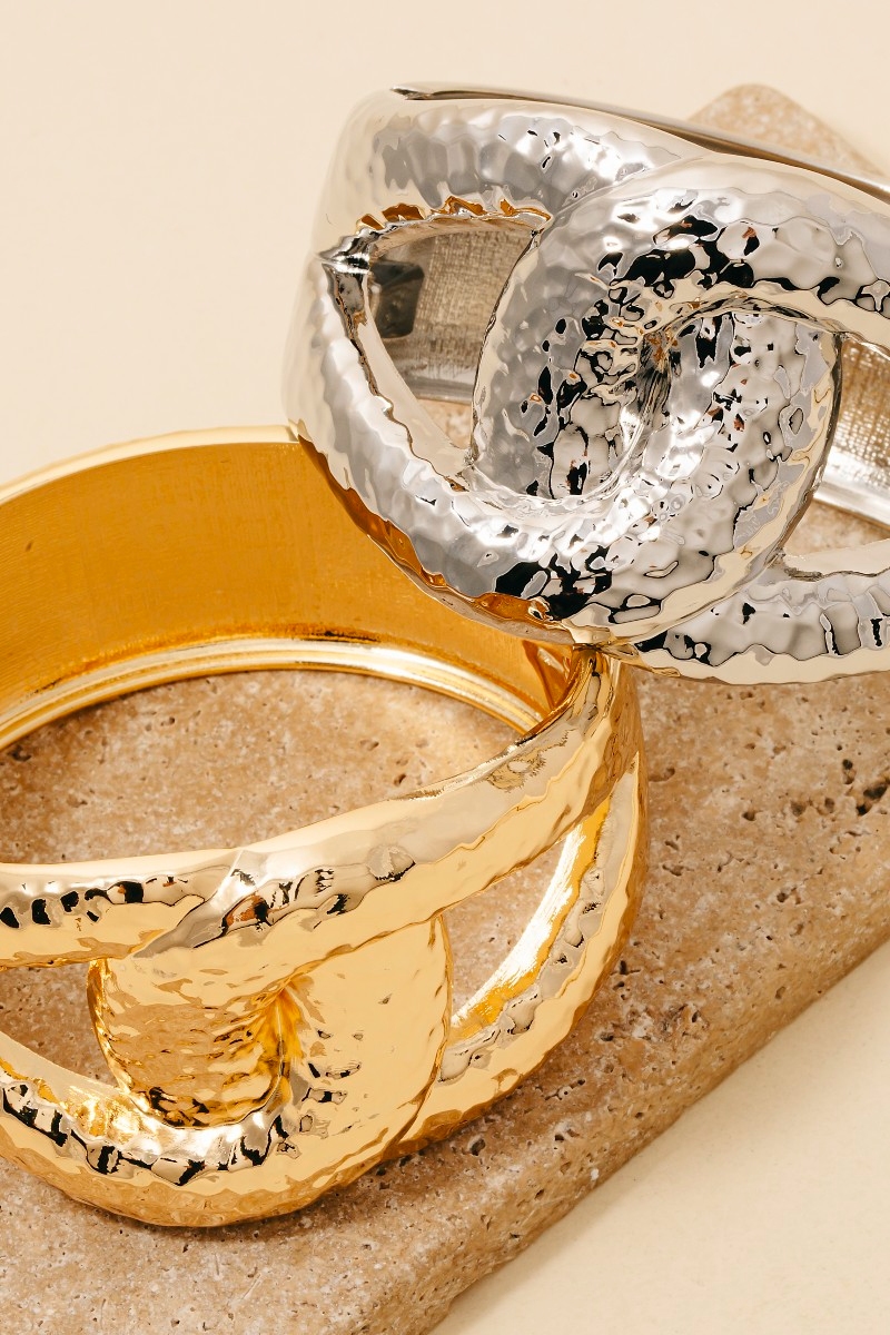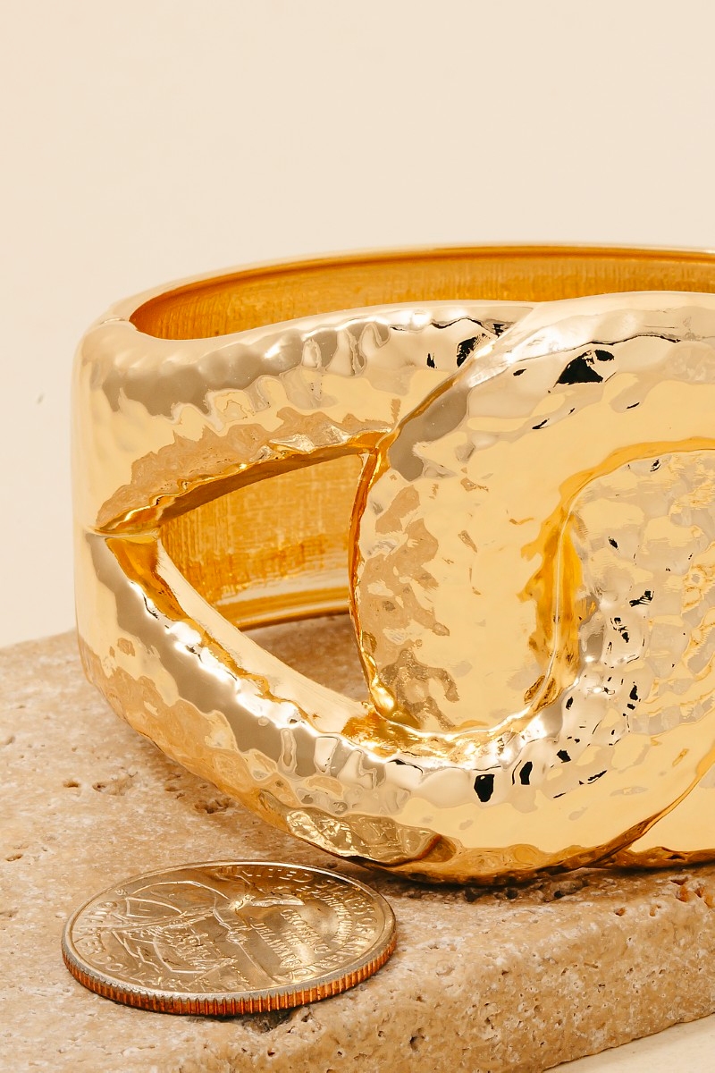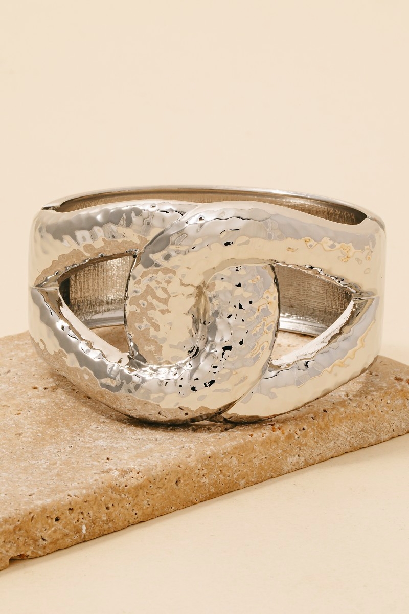 - Elevate your style with something unique and daring, this bangle bracelet showcases an alluring hammered textured link hinge design. Elevate your personal style effortlessly with this versatile bangle bracelet, an essential component for a refined wardrobe. Available in G, S. This item is sold in packs of 1.