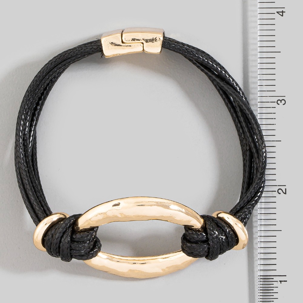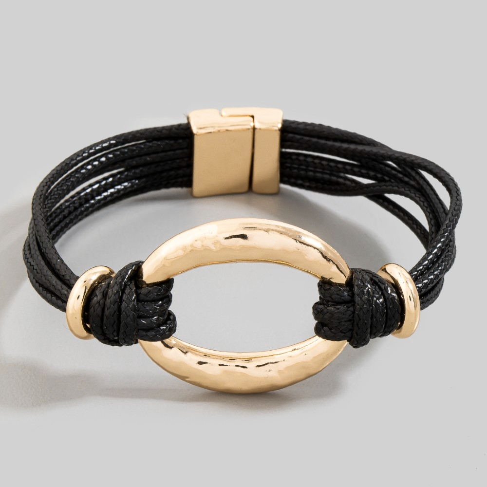 • Add some edge to your wardrobe, this bracelet flaunts a luxurious magnetic clasp oval hoop corded design. Elevate your fashion statement with this versatile bracelet, adding a touch of glamour to your everyday look. Available in BK, IV. This item is sold in packs of 1.