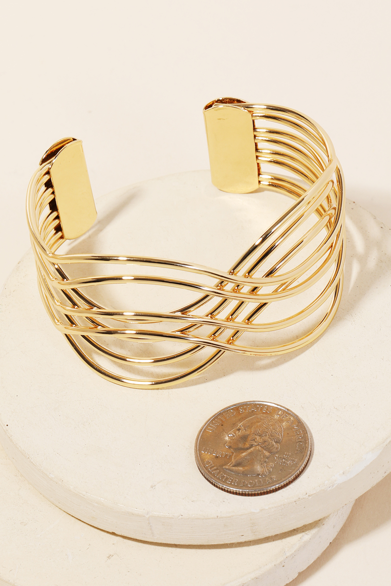A simply stunning in season must have cuff bracelet features a gorgeous metallic wave strand cuff bracelet design. This is the perfect gift for a special someone. Available in G and S. This item is sold in packs of 1.
