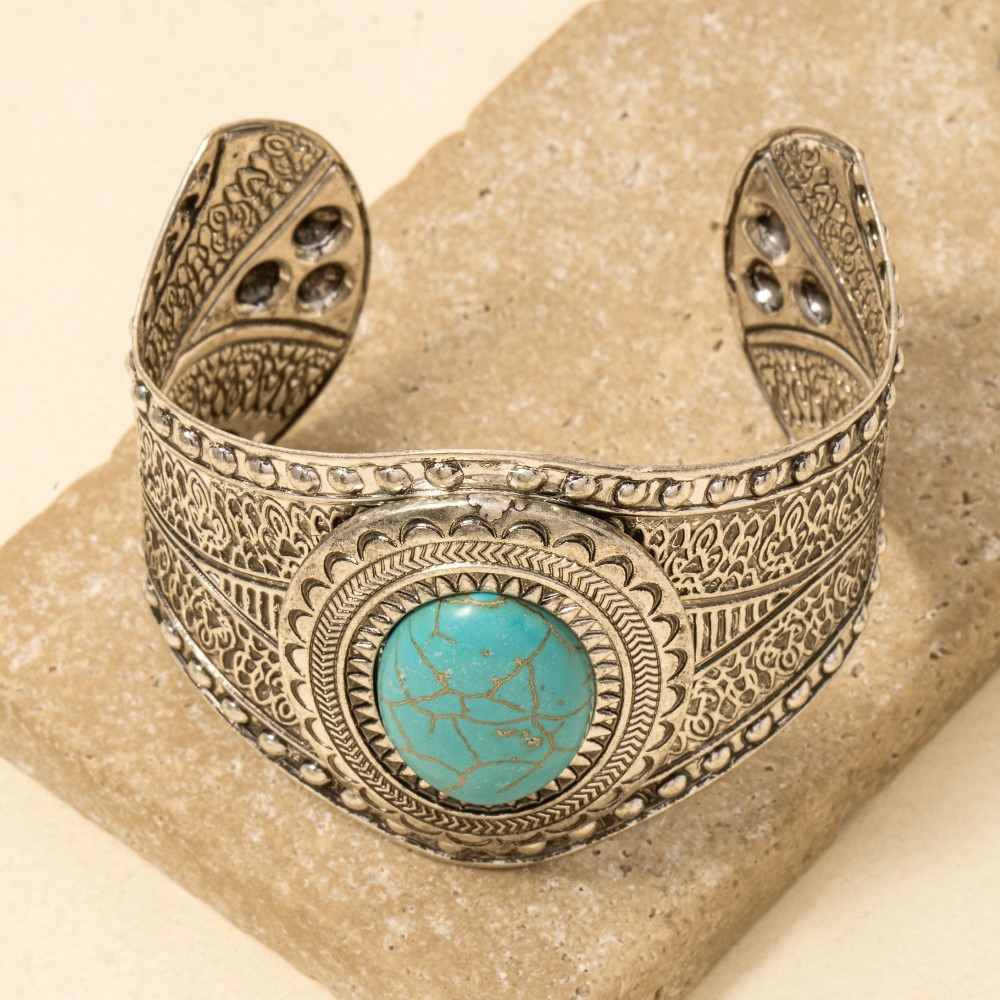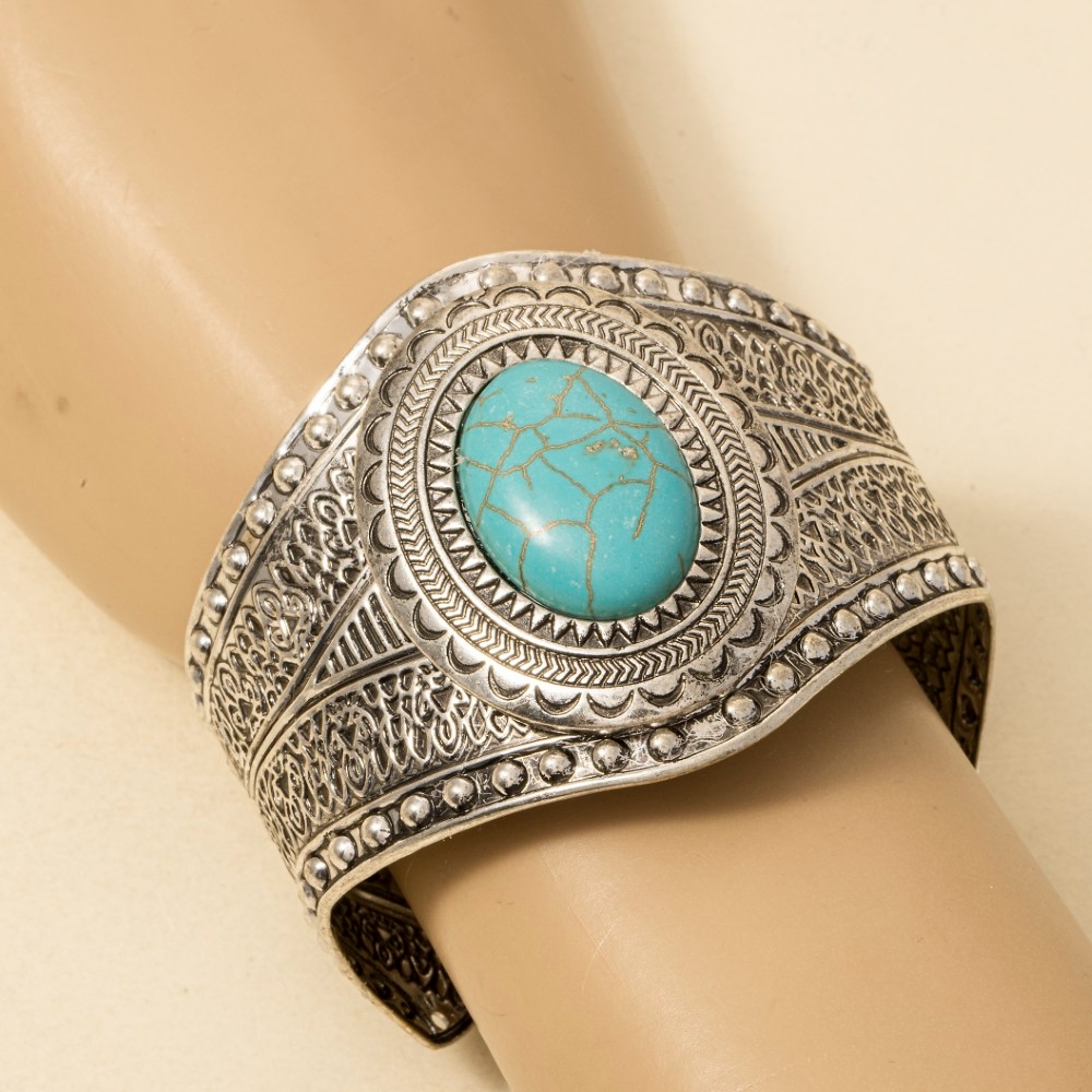 Perfectly polished and endlessly versatile, this cuff bracelet embodies a sophisticated oval turquoise stud western engraved design. Elevate your fashion statement with this versatile cuff bracelet, adding a touch of glamour to your everyday look. Available in SBTQ. This item is sold in packs of 1.
