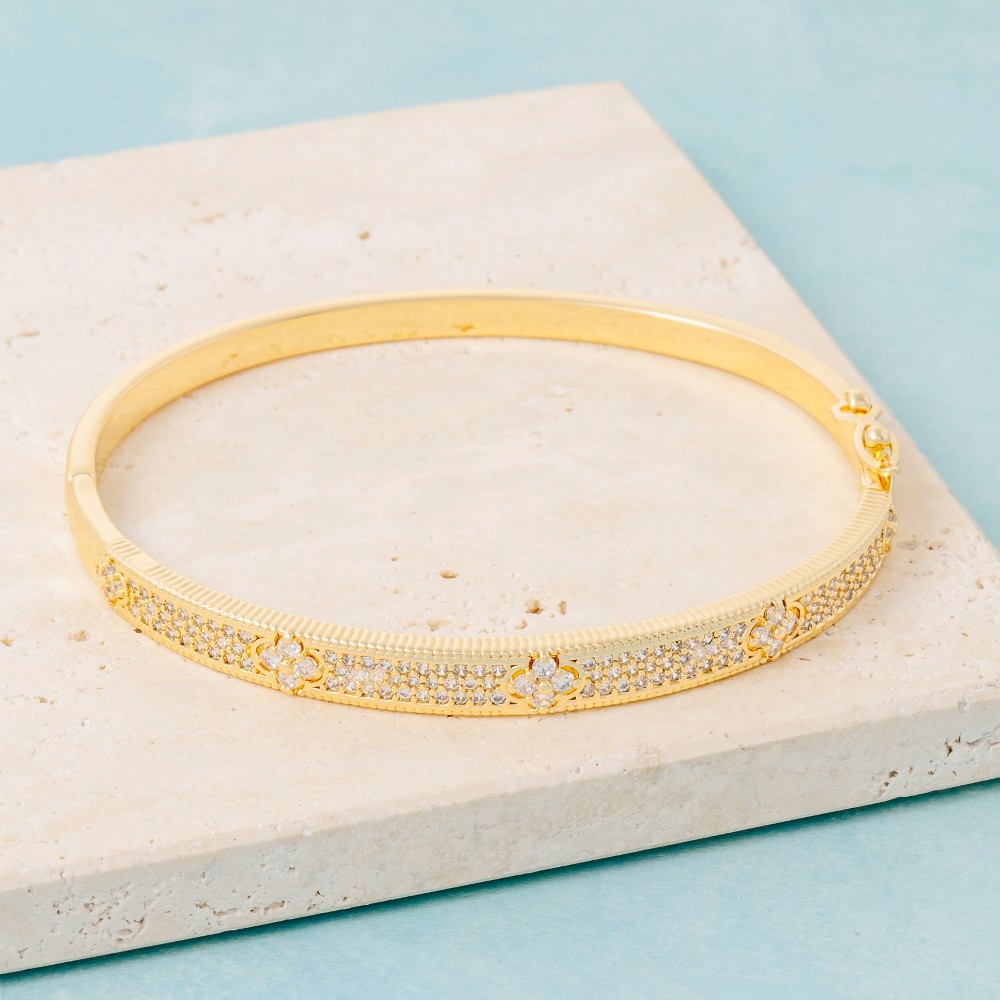 Gold Dipped Cz Mother Of Pearl Clover Hinge Bangle Bracelet