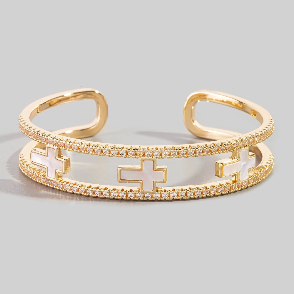 A stunning addition to any jewelry collection, this cuff bracelet contains a special pave double row cross design. A chic and sophisticated cuff bracelet that's perfect for dressing up or down. Available in GM. This item is sold in packs of 1.