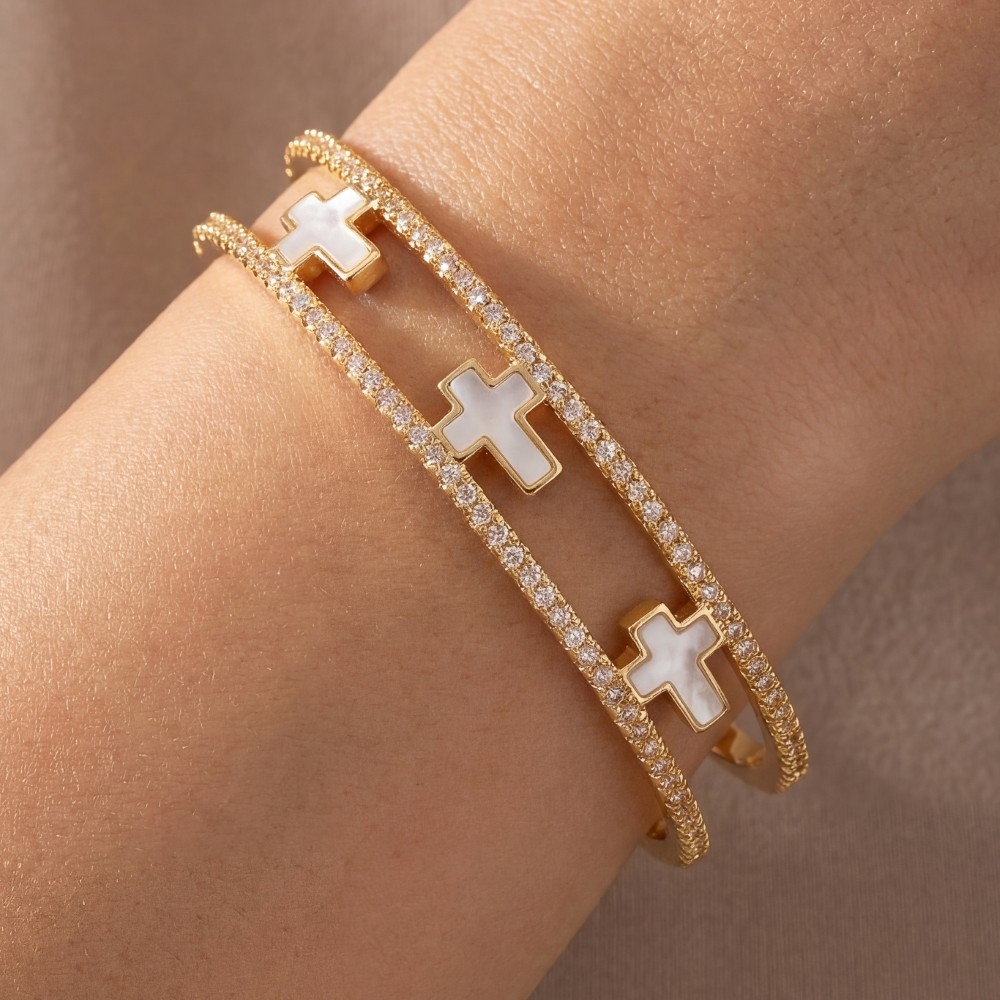 This cuff bracelet is made with 85% Brass and 5% Cubic Zirconia10% Mother Of Pearl.