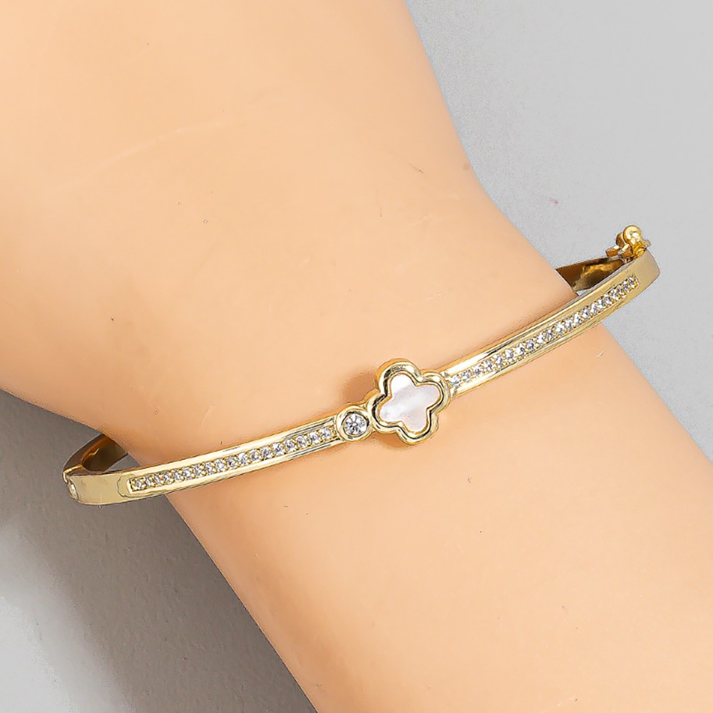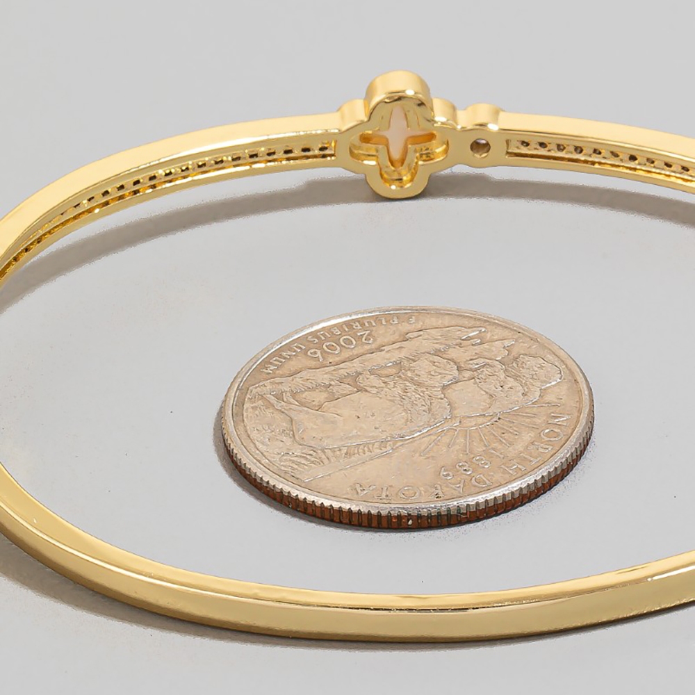 Gold Dipped Cz Mother Of Pearl Clover Hinge Bangle Bracelet