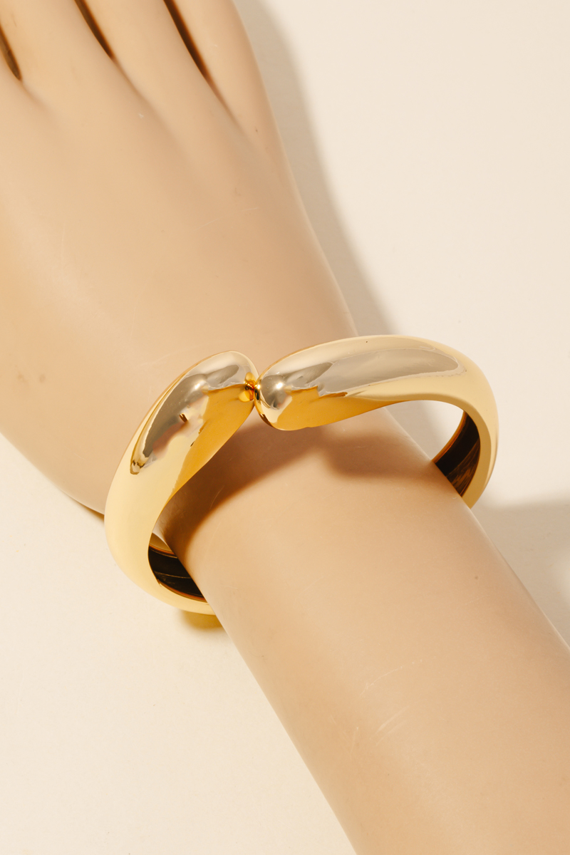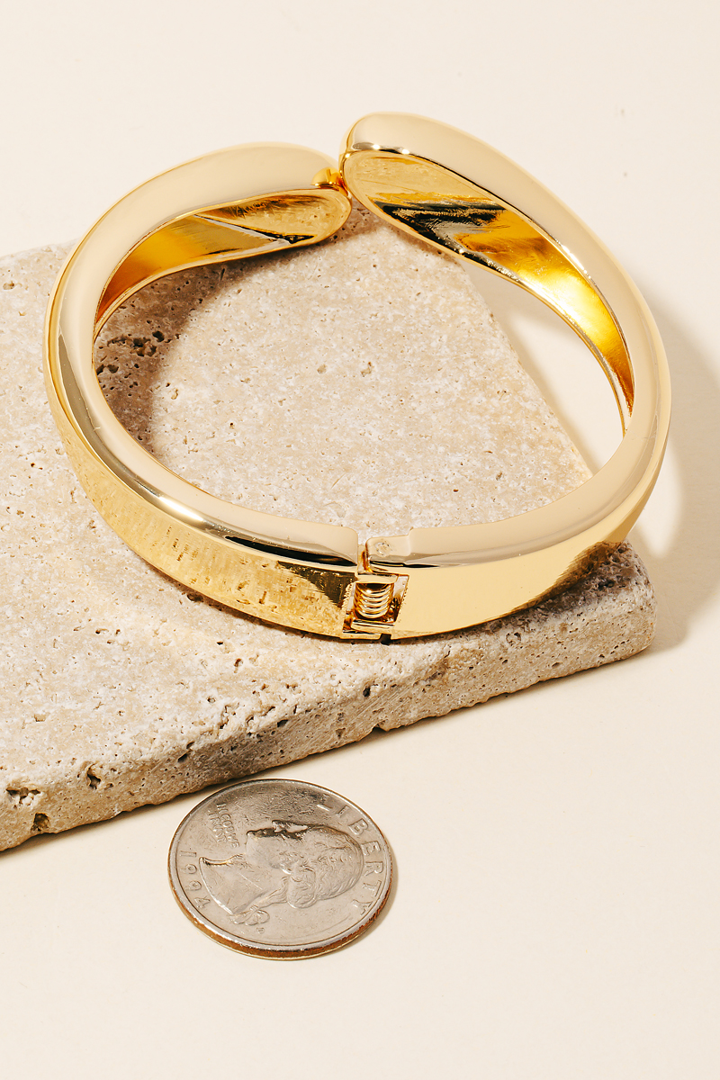 Perfect for any fashion-forward individual, this bangle bracelet highlights a special rounded edge metallic hinge design. This item is ideal for those who want to add some personality to their outfits without being too bold. Available in GD and SV. This item is sold in packs of 1.
