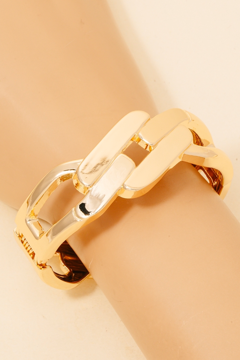 • Effortlessly elevate your outfit, this bangle bracelet reveals an intricate solid metallic chain hinge design. This bangle bracelet is ideal for both casual and formal events, adding a touch of sophistication to any outfit. Available in Gold. This item is sold in packs of 1.