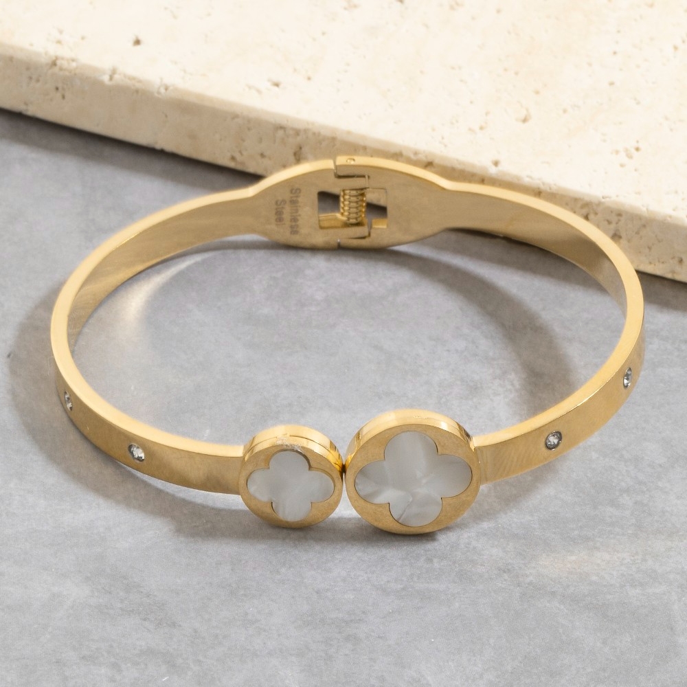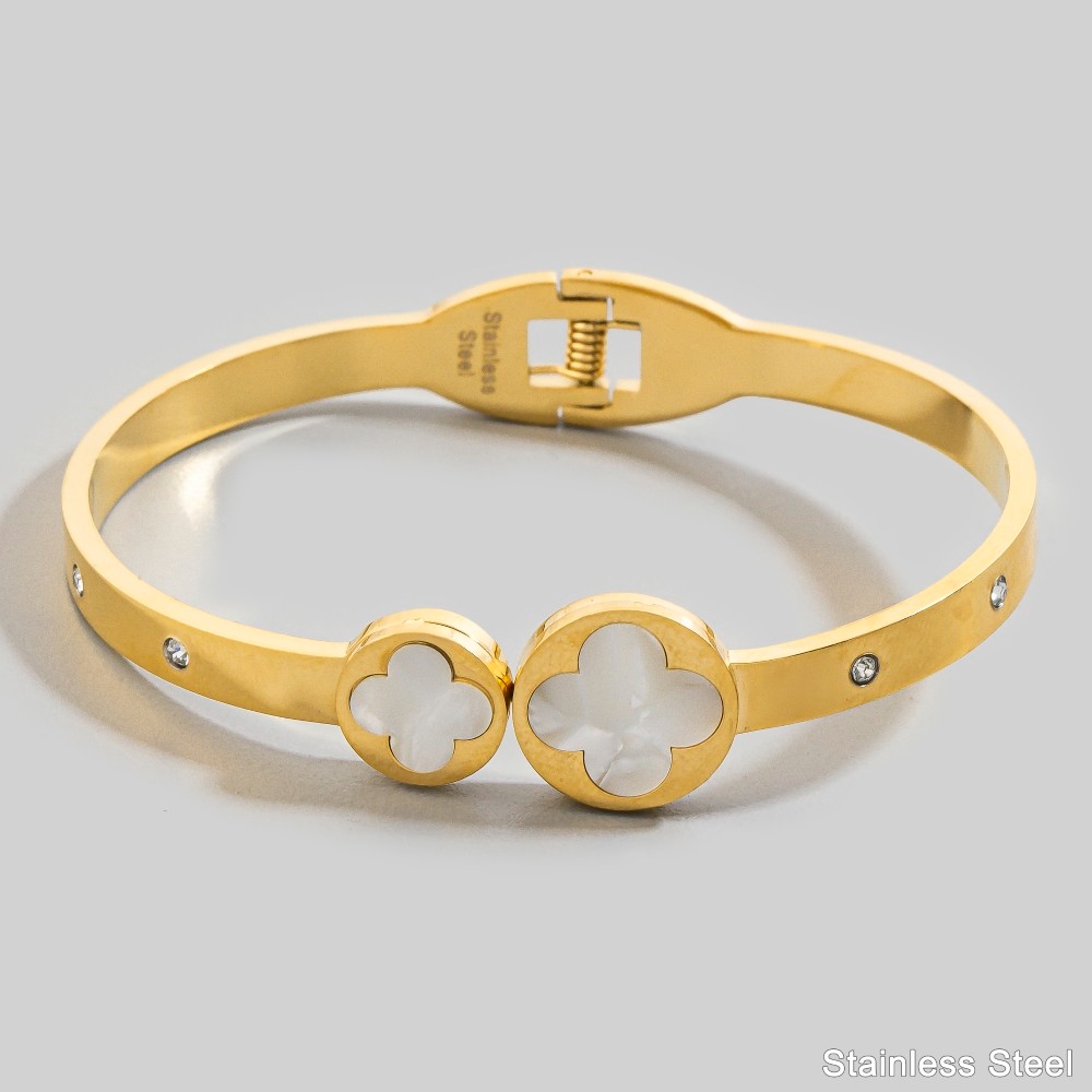 • Add some edge to your look, this bangle bracelet highlights a special stainless steel mother of pearl clover hinged design. Perfect for adding some personality and flair to your wardrobe, this bangle bracelet is a must-have. Available in GMOP. This item is sold in packs of 1.