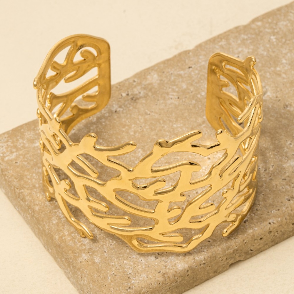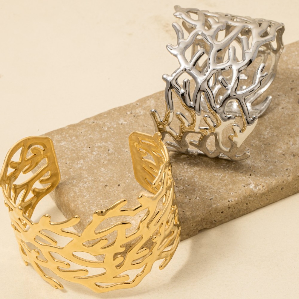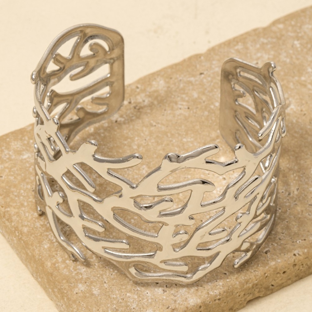 • The perfect way to elevate any outfit, this cuff bracelet contains a special stainless steel coral pattern wide design. A perfect addition to your wardrobe that effortlessly enhances your style. Available in GD, RH. This item is sold in packs of 1.