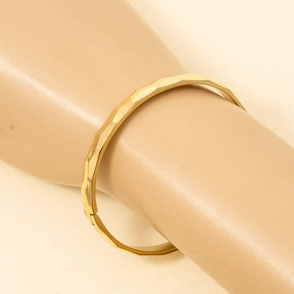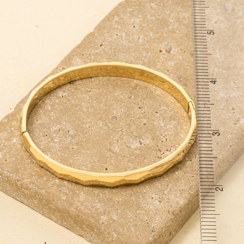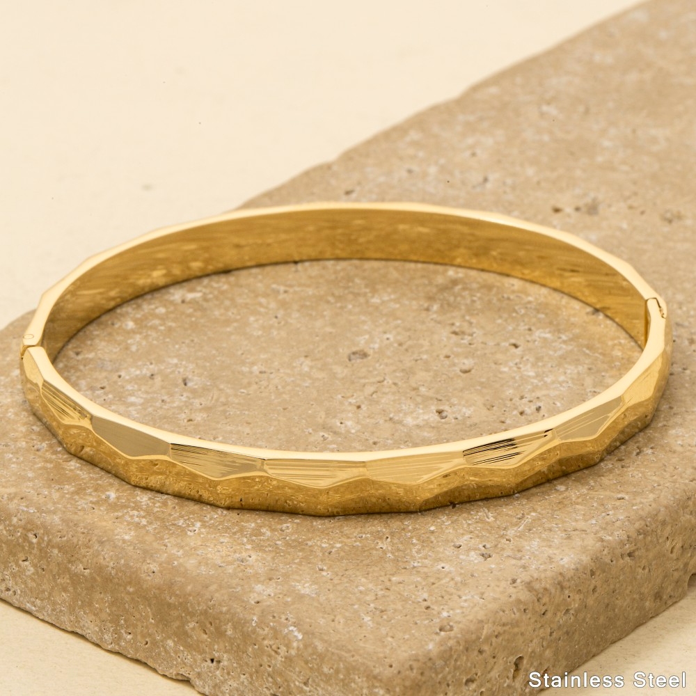 • Unleash your inner fashionista, this bangle bracelet features an exceptional stainless steel hammered design. Perfect for adding some texture and dimension to any outfit, this bangle bracelet is a must-have. Available in G, S. This item is sold in packs of 1.