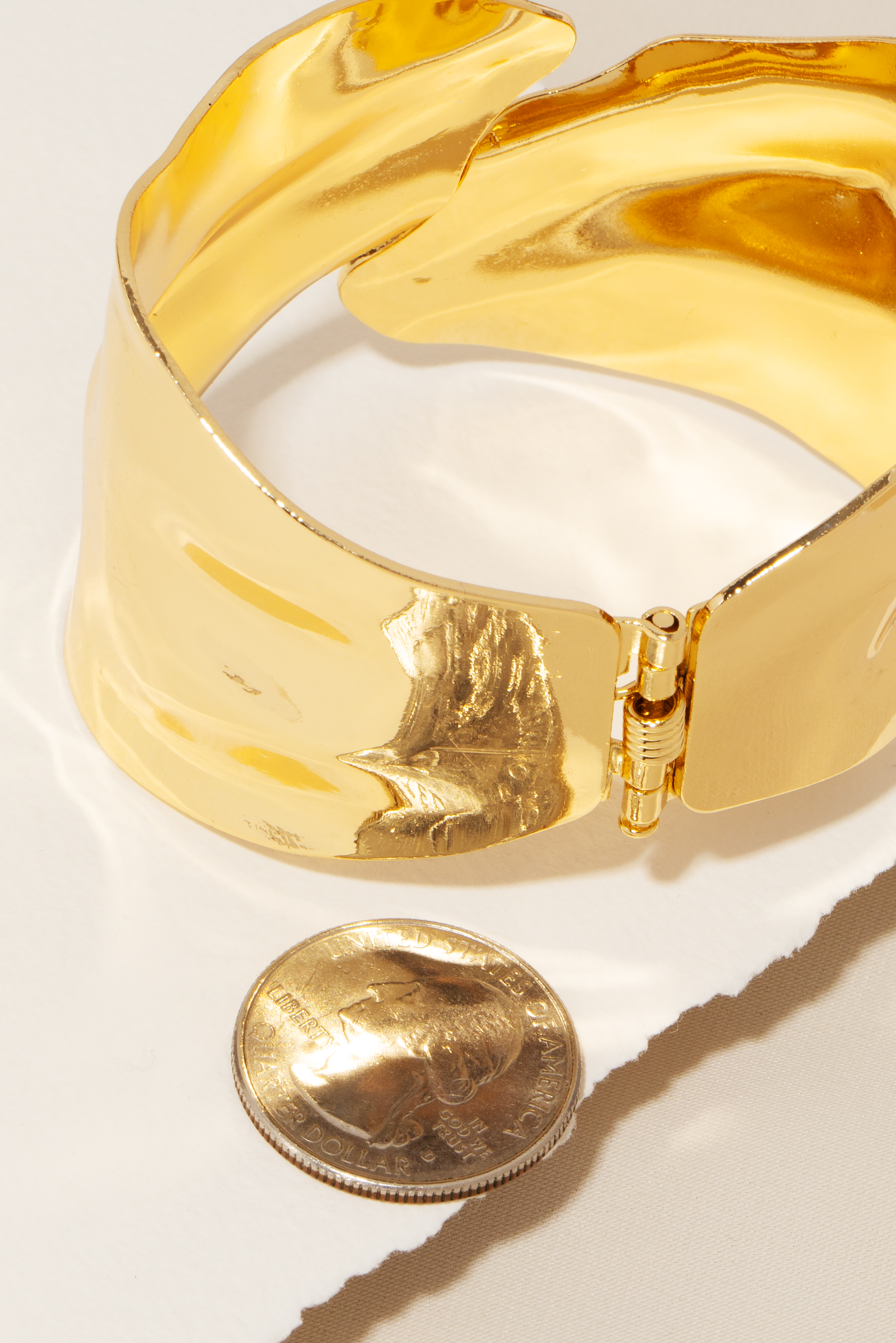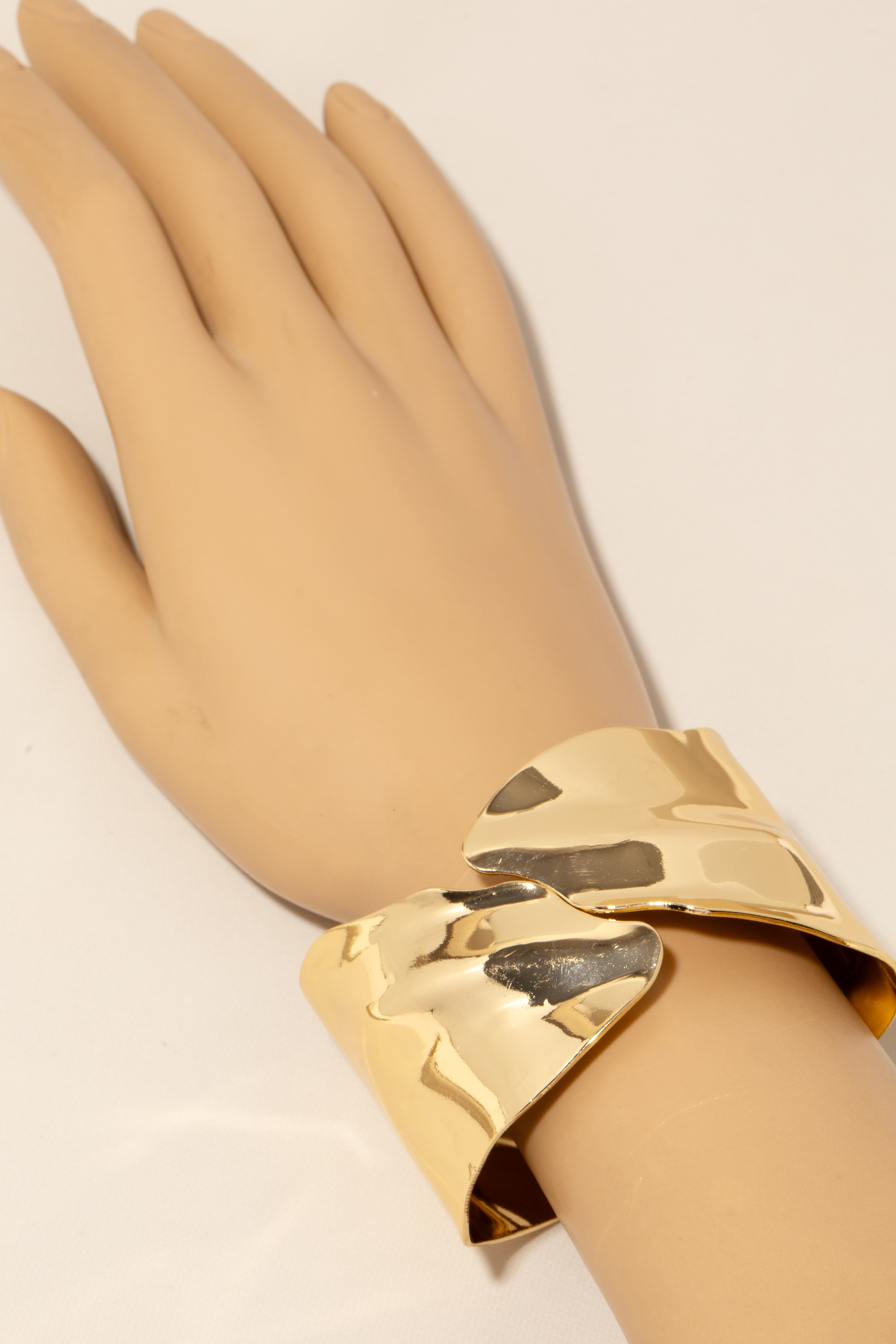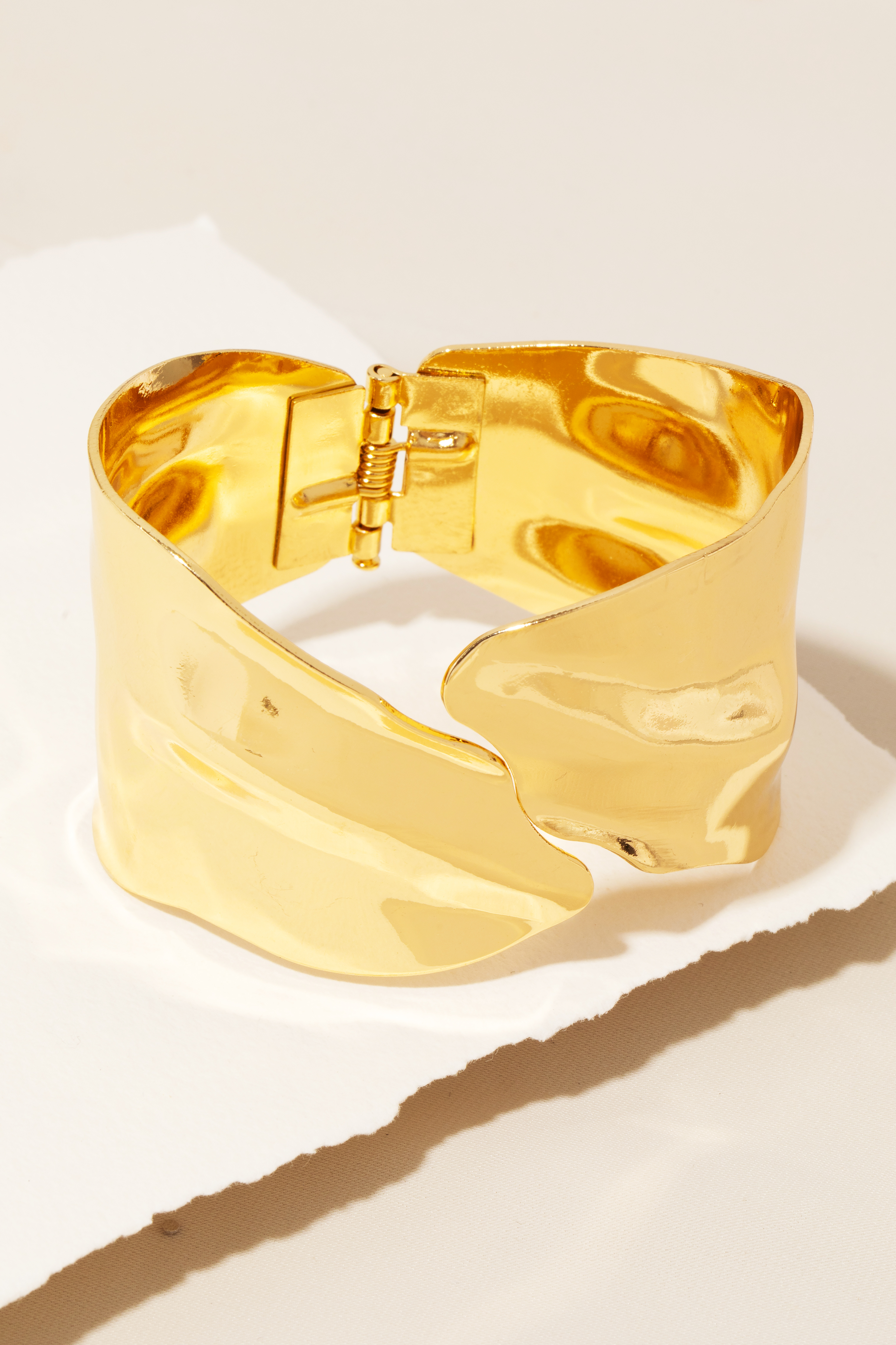 • A classic design with a modern twist, this cuff bracelet adds a distinctive warped metallic hinge design. A must-have accessory that adds a unique flair to any look. Available in G and RH.