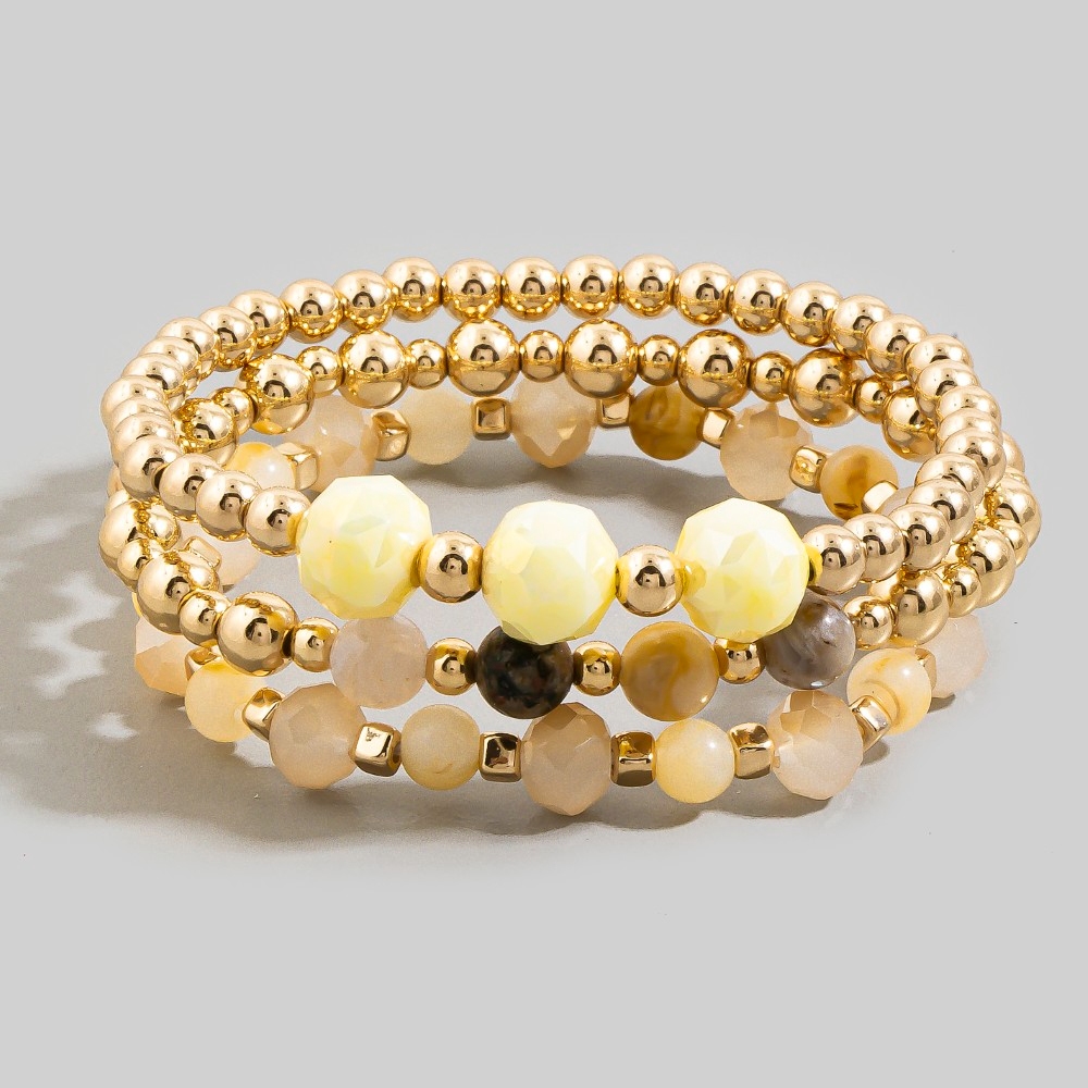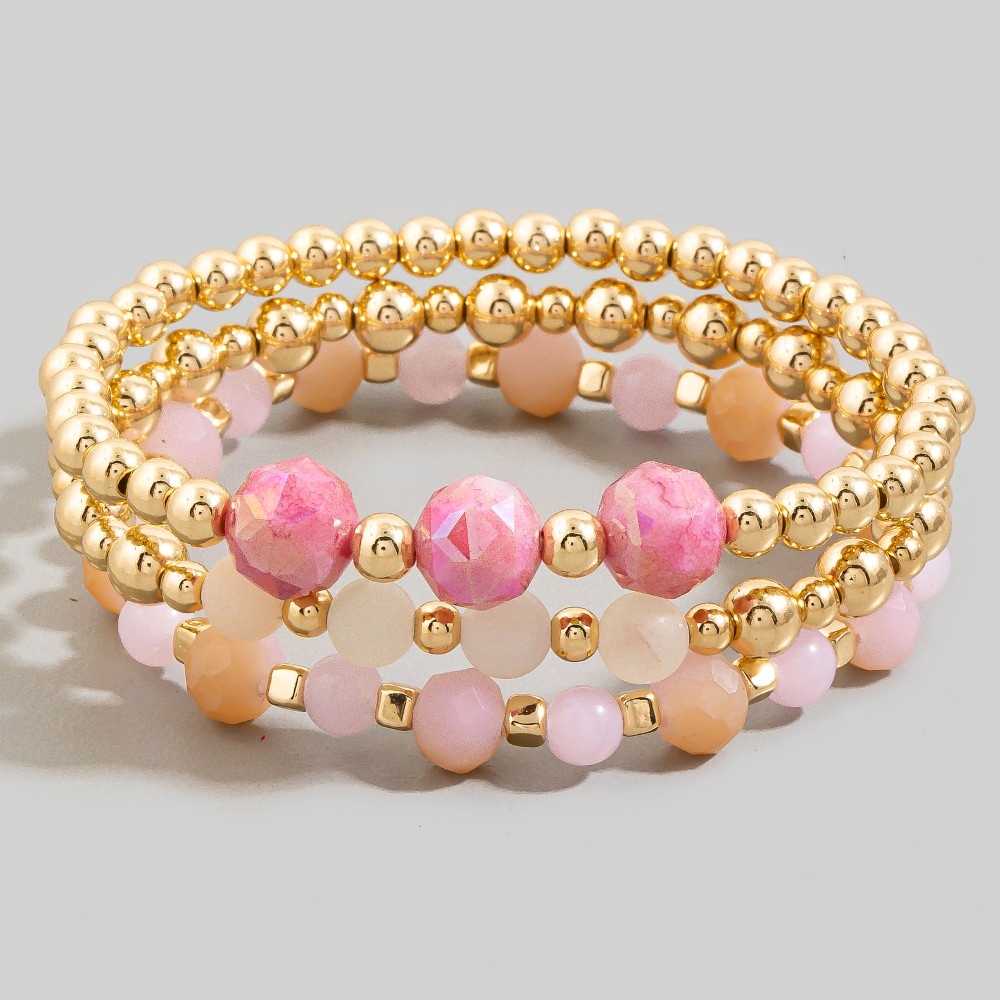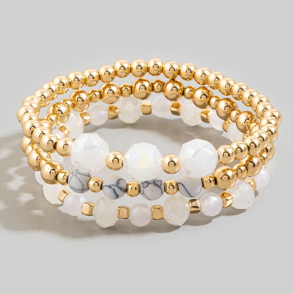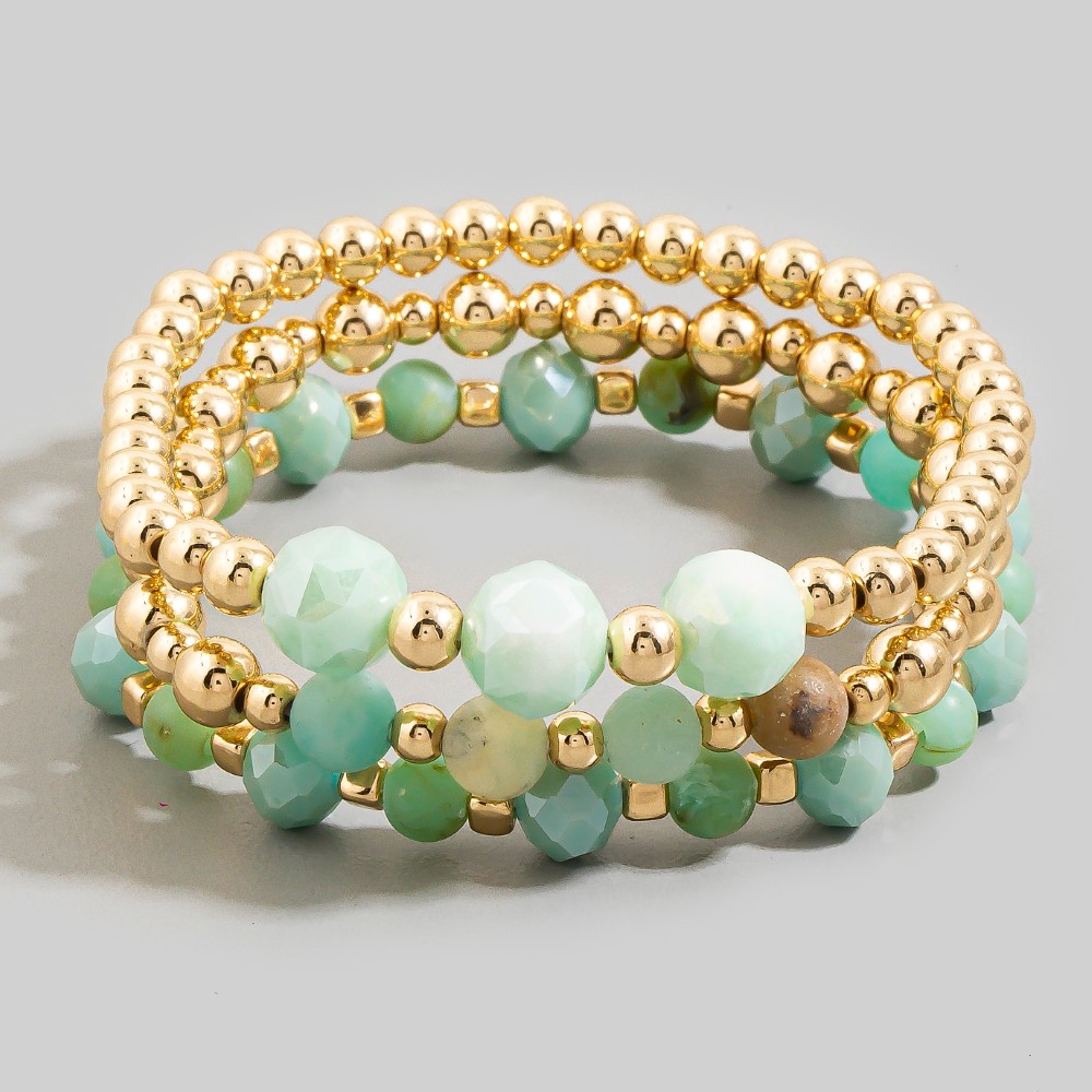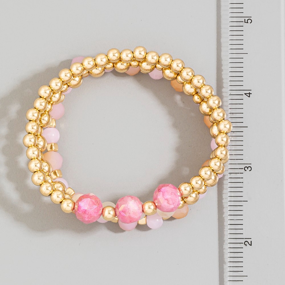 • The epitome of sophistication and style, this stretch bracelet showcases an alluring faceted stone & gold bead set design. Perfect for adding a touch of glamour and sophistication to any outfit, this stretch bracelet is a must-have. Available in GDMINT, GDNAT, GDPINK, GDWHT. This item is sold in packs of 1.