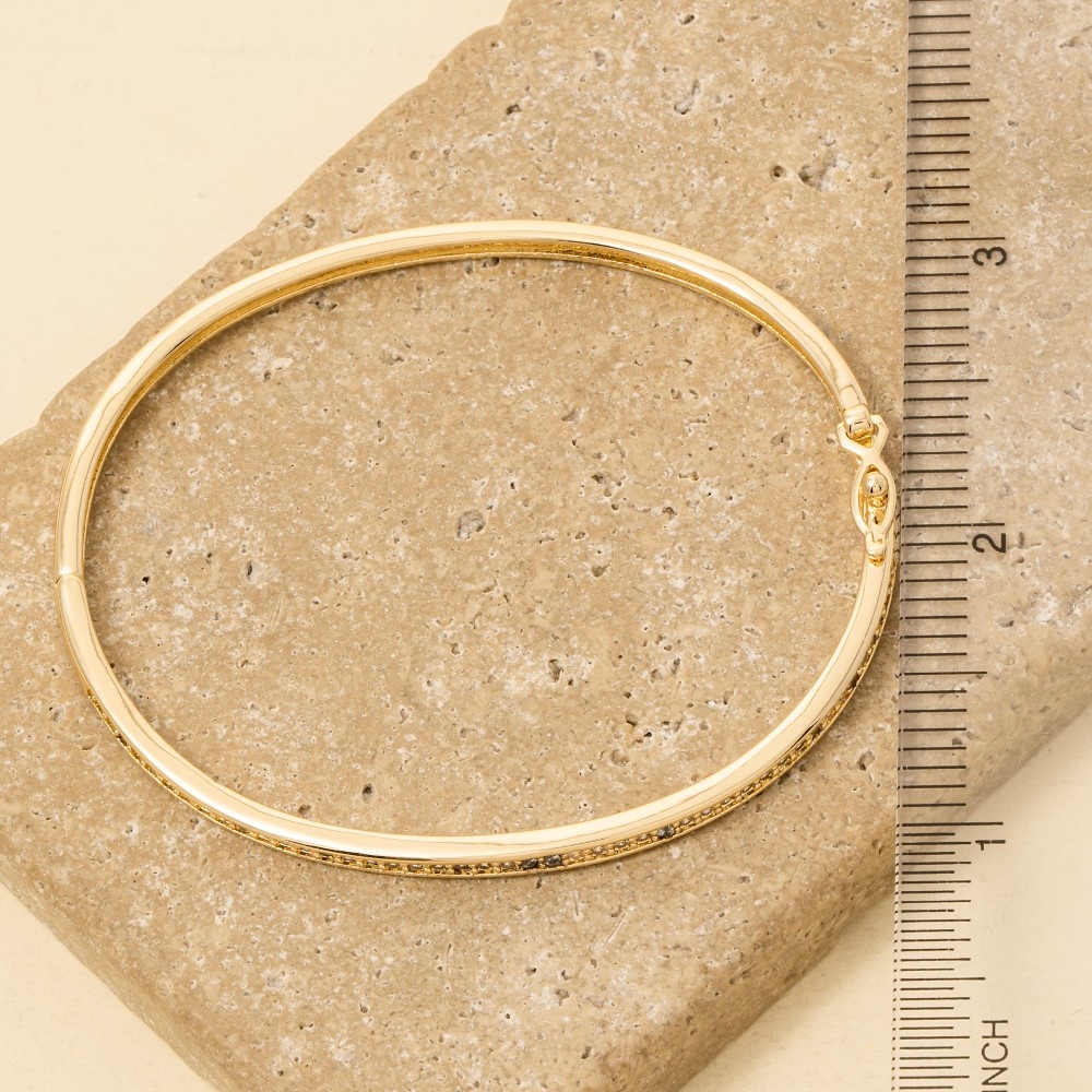 A versatile and stylish addition to any wardrobe, this bangle bracelet introduces an exceptional gold dipped cubic zirconia pave hinge design. This bangle bracelet is a great way to add some flair to your outfit without going over the top. This item is sold in packs of 1.