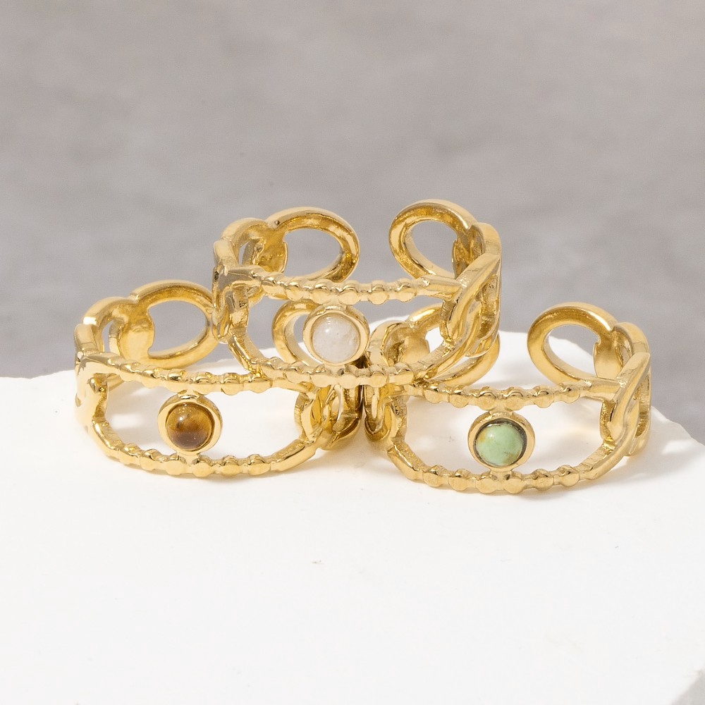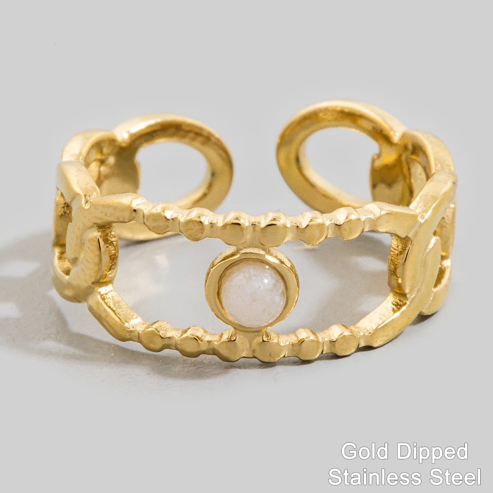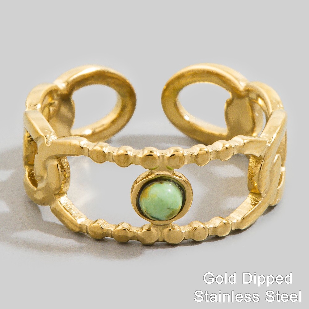 • Effortlessly elevate your outfit, this ring boasts a magnificent gold dipped stainless steel chain link design. This ring is ideal for both casual and formal events, adding a touch of sophistication to any outfit. Available in BR, GN, IV. This item is sold in packs of 1.