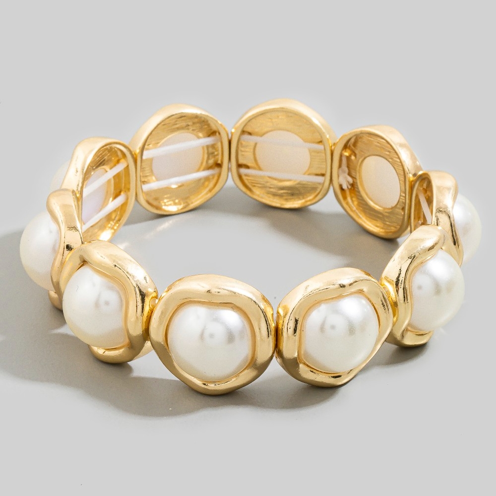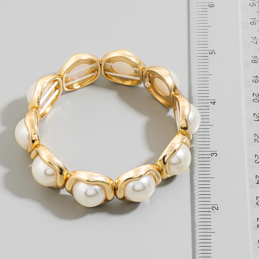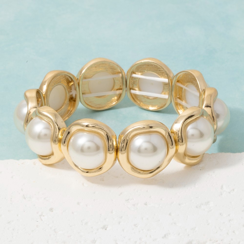 • A contemporary masterpiece, this stretch bracelet incorporates a flawless gold round pearl cabochon design. This versatile stretch bracelet adds a touch of elegance to any outfit. Available in GDCM. This item is sold in packs of 1.
