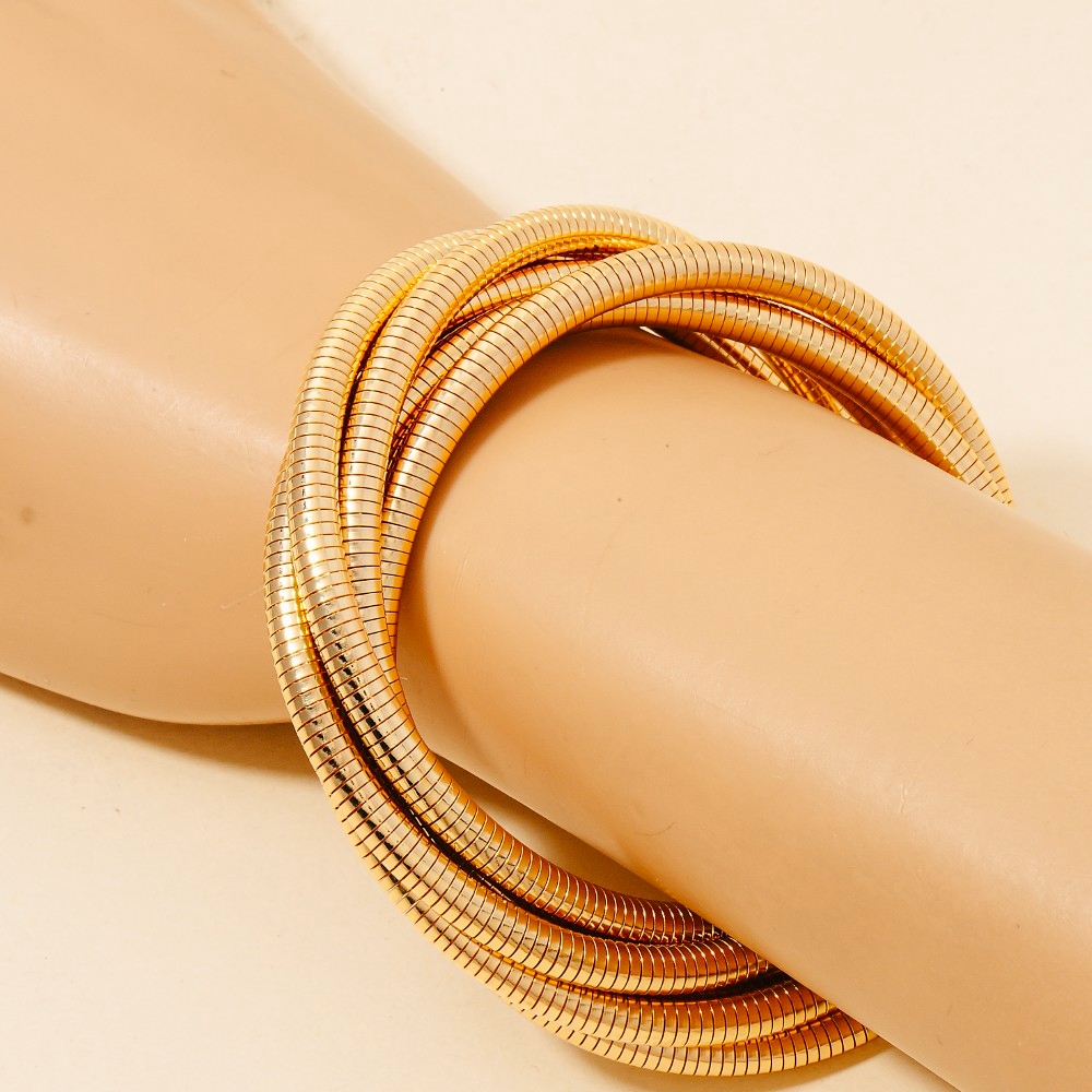 - Add a touch of luxury to any outfit, this bracelet radiates a sleek knotted elastic metallic coil set design. A must-have bracelet that effortlessly enhances your style, no matter the occasion. Available in G, MP, R. This item is sold in packs of 1.