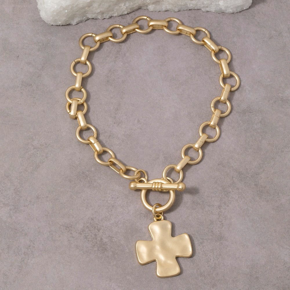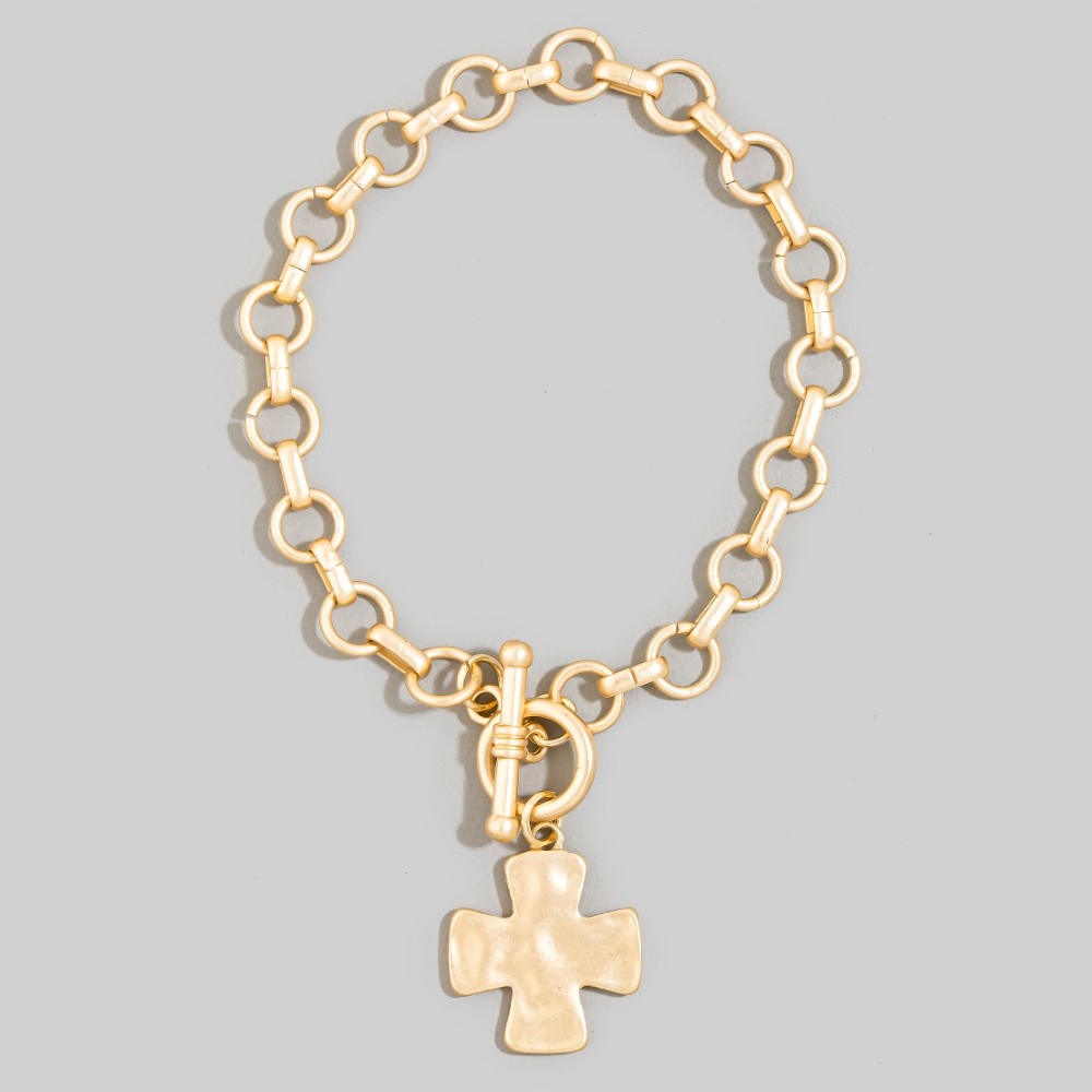 • Add a touch of luxury to any outfit, this chain bracelet contains a special matte metallic cross charm toggle design. This item adds the perfect finishing touch to any outfit, making it stand out from the crowd. Available in SGD. This item is sold in packs of 1.