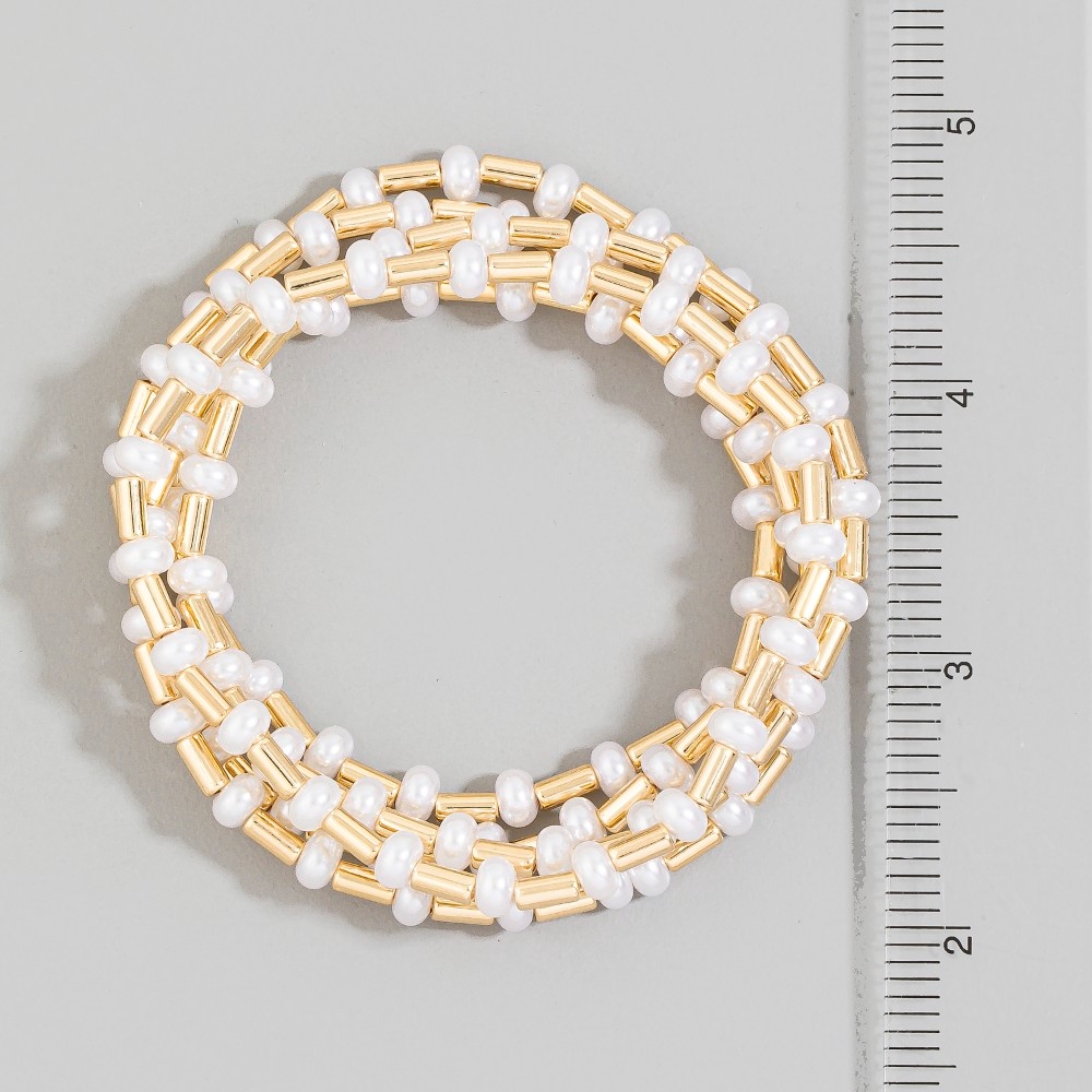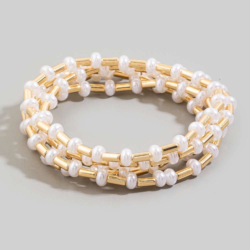 Perfect for any occasion, this stretch bracelet showcases a breathtaking pearl & gold tube beaded set design. This stretch bracelet is a great way to add some glamour and sophistication to your outfit. Available in GD. This item is sold in packs of 1.