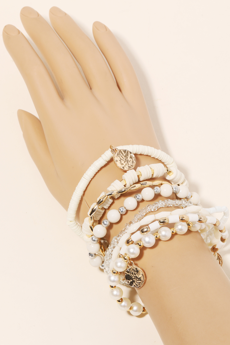 - Hot chic and trending in season must have stackable bracelet that is made into a assorted disc bead stackable bracelet set design. This is a gorgeous chic accessory that everyone will want! This item is sold in packs of 2.