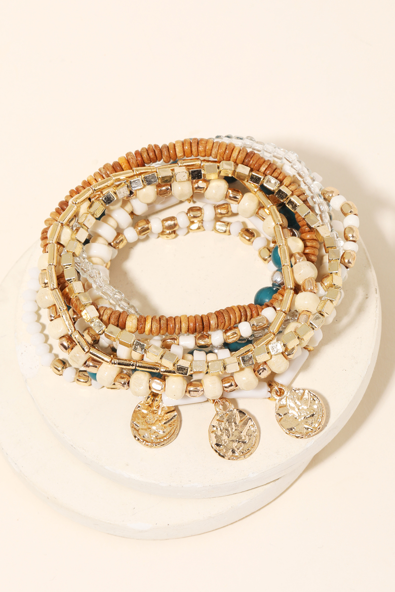 • This new stunning bracelet that is made with a assorted multi bead coin bracelet set design. A cute must have for this Spring season! This item is sold in packs of 1.