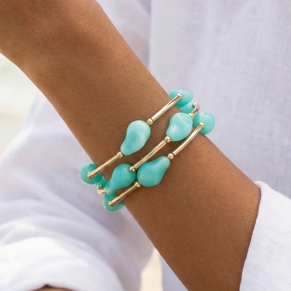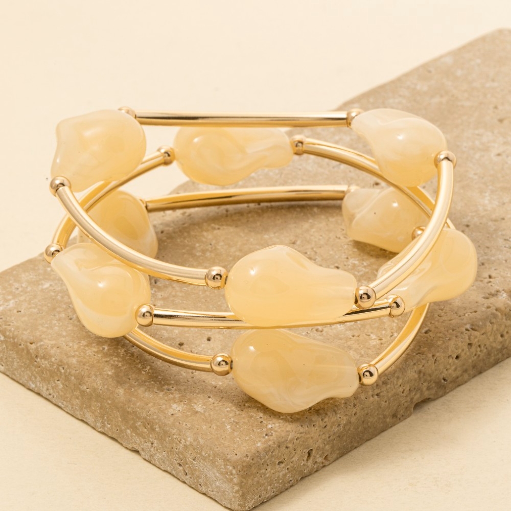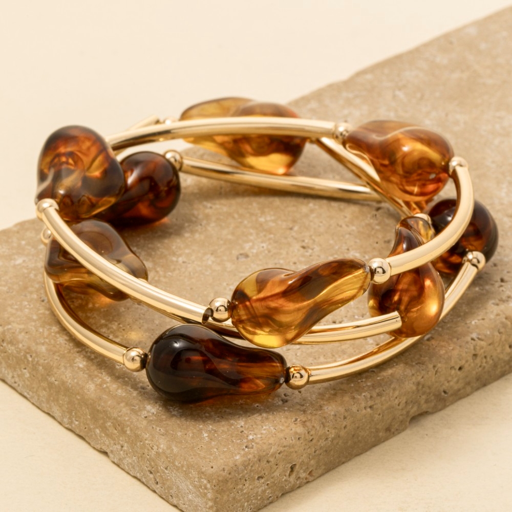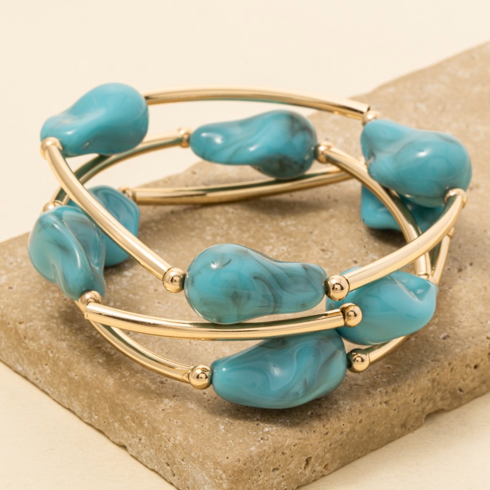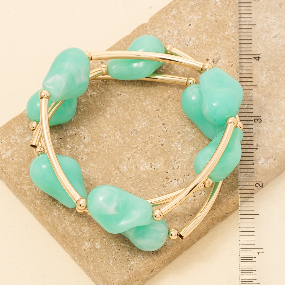 • Elevate your style with something unique and daring, this bracelet radiates a sleek marble resin irregular beads and metallic tubes set design. Redefine your fashion identity with this versatile bracelet, a timeless piece that complements any wardrobe. Available in GDBEG, GDMIN, GDPNK, GDTOR, GDTQS. This item is sold in packs of 1.