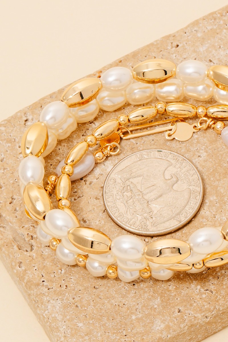 • Bold, daring, and endlessly stylish, this stackable bracelet presents a striking mixed pearl and metallic beaded bracelet set design. Redefine your fashion identity with this versatile stackable bracelet, a timeless piece that complements any wardrobe. Available in GDCRM. This item is sold in packs of 1.