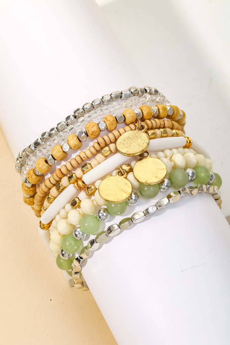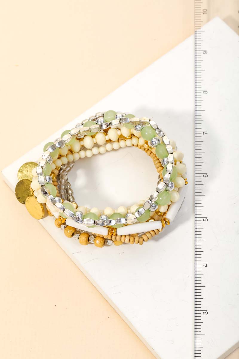- A glamorous stunning classy unique and trending hot must have bracelet that is made with a coin charms beaded bracelets set design. Fits well with almost any outfit! Available in Ivory.