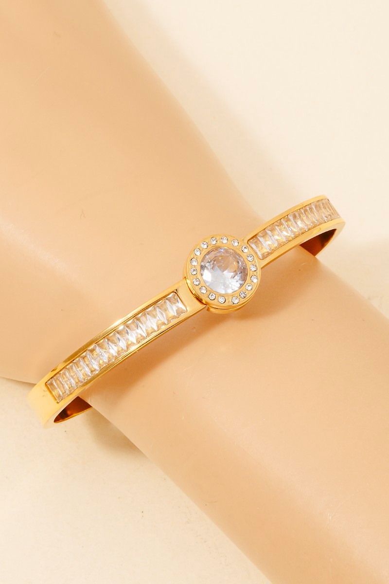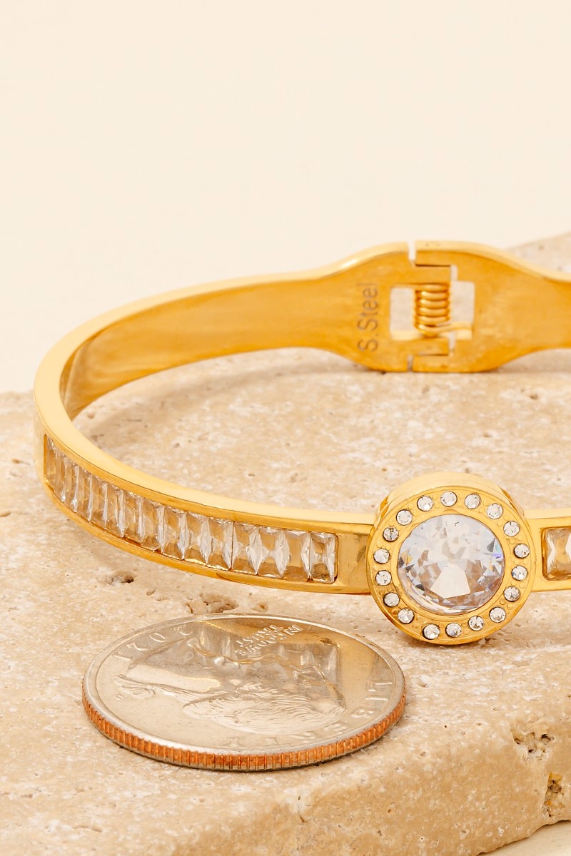 • This bangle bracelet displays a vibrant stainless steel cubic zirconia pave hinge style. Embark on a journey of sartorial refinement as this bangle bracelet effortlessly complements your fashion sense.